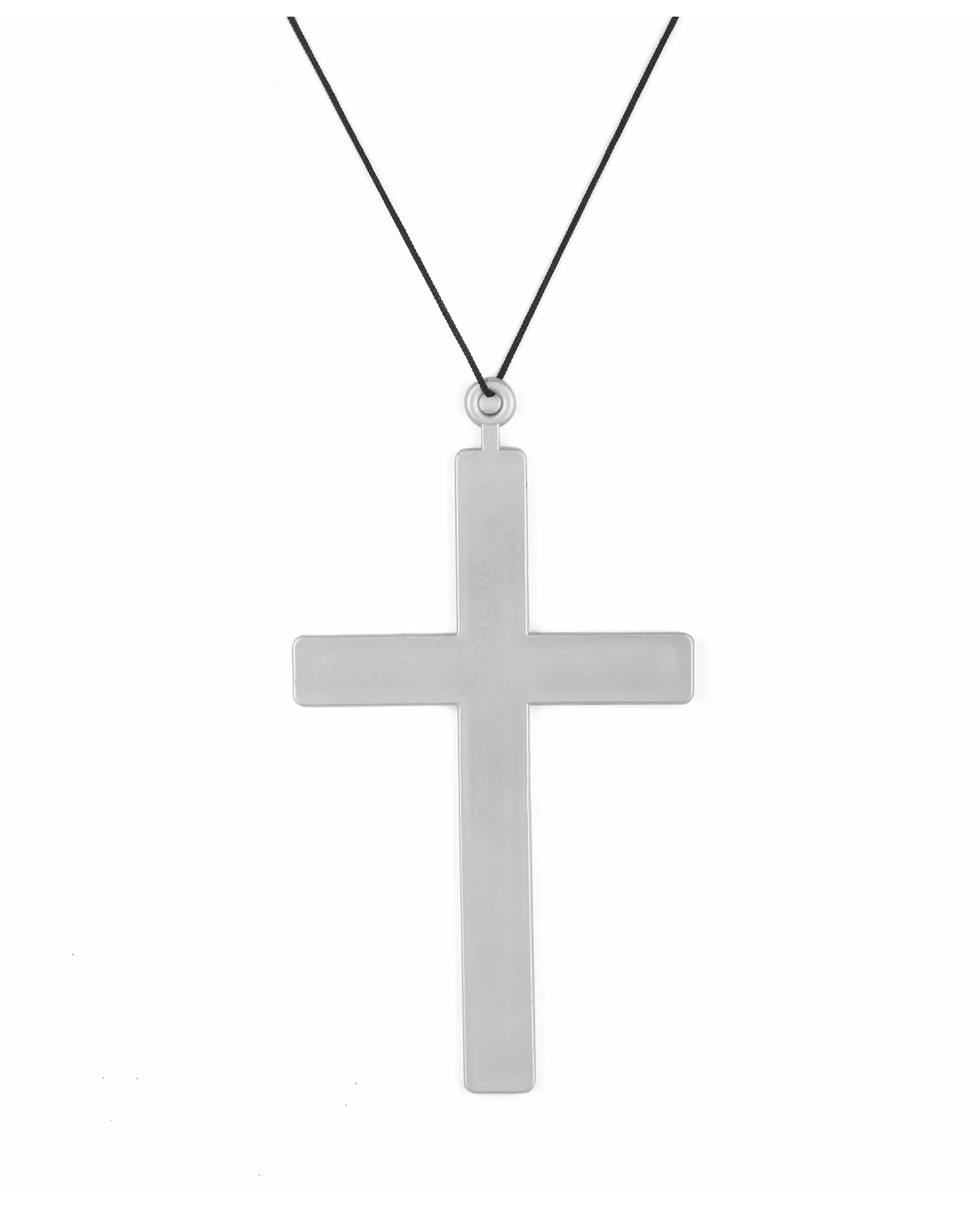 Fullfør ditt religiøse antrekk med dette store krusifikset! Dette store korset på 23 cm er tilbehøret du trenger for å perfeksjonere ditt religiøse eller kirkelige antrekk. Sølvfarget og veldig lett, det plasseres rundt halsen takket være snoren og er veldig enkelt å bruke. Garantert effekt!. Inkludert tilbehør: Kors