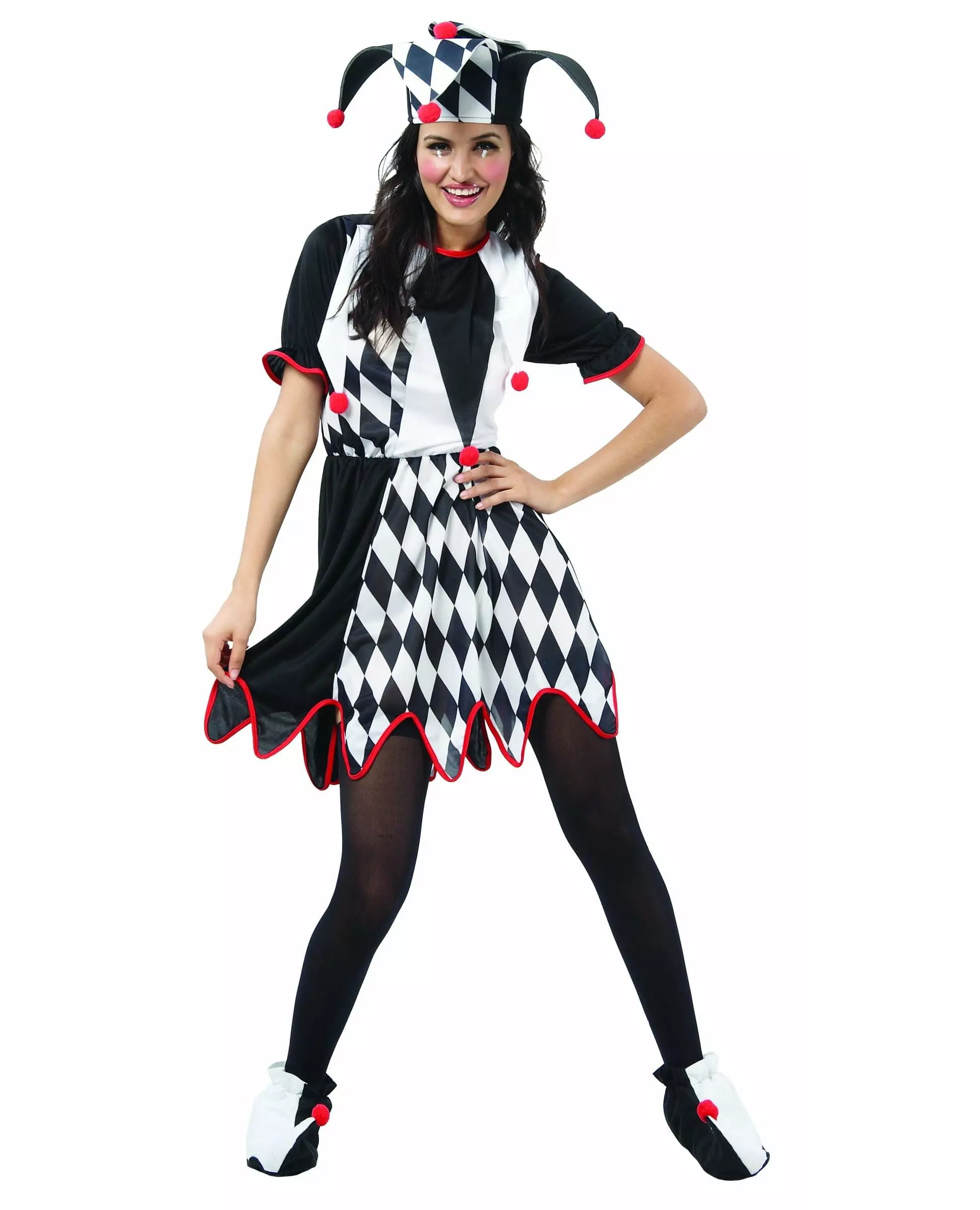 Med rød pompong! Dette narrekostymet for kvinner består av en svart og hvit kjole med rød flette i endene av kjolen (sko og stokk er ikke inkludert). En matchende narrehatt fullfører dette ideelle antrekket til karneval eller en temafest med venner. Inkludert tilbehør: Dresshatt Materiale: 100 % POLYESTER Stell: Håndvaskbar Målinformasjon: Midjebredden er omtrent 33 cm og 95 cm lang.