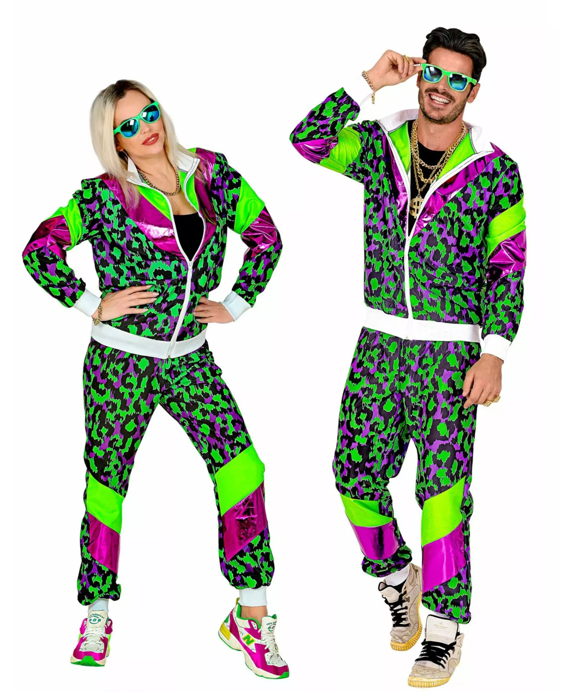 Prangende joggebukser til festival! Det perfekte kostymet til en kitsch-kveld eller festival. Dykk ned i hjertet av 80-tallet! Dette leopardprintede treningsdraktkostymet er for voksne og består av en jakke og bukser. Antrekket er grønt med et svart og lilla leopardtrykk. Den langermede jakken har glidelås som gjør at du enkelt kan ta den på. Den er dekorert med brede, prangende grønne og lilla bånd på brystet og ermene som vil minne deg om 80-tallet. Midjen og mansjettene er elastiske og hvite. Buksene er også dekorert med brede, prangende lilla og grønne bånd for et retro og ukonvensjonelt utseende. Den hvite elastikken ved anklene lar deg justere buksene. For å fullføre kostymet ditt og gjøre et inntrykk på 80-tallsfesten eller festivalen din, kan du pynte det med fluorescerende briller, en parykk eller annet retro og prangende tilbehør. Gå for fluorescerende med dette trykte treningsdraktkostymet med leopardtrykk til en kitsch-kveld eller på en festival!. Inkludert tilbehør: Jakke Bukser Materiale: 100 % polyester Vedlikehold: Håndvask