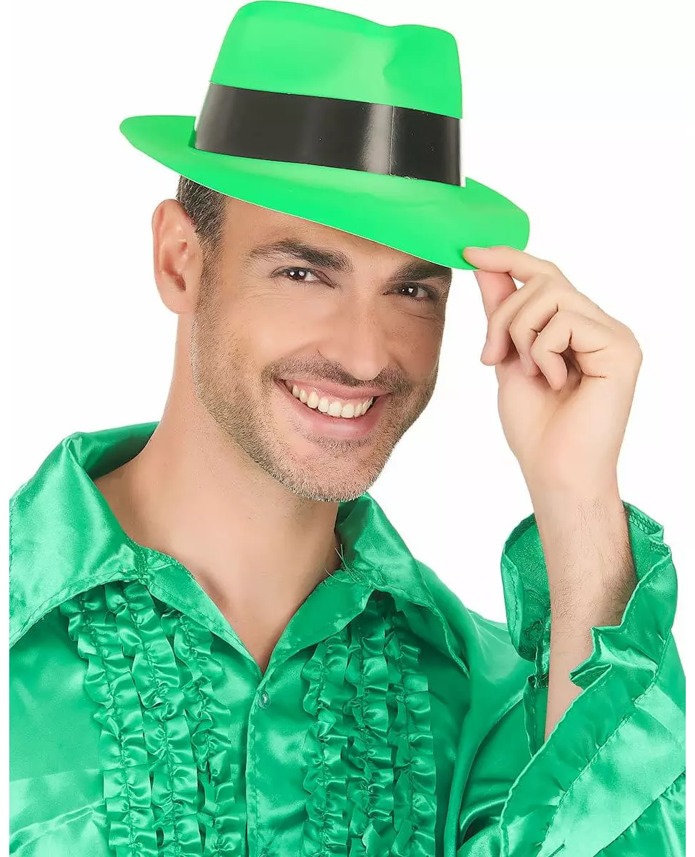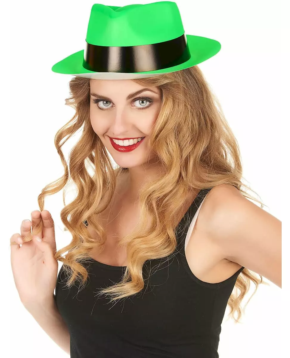 Våg å bli grønn! Denne neongrønne gangsterhatten er laget av tynn, formbar plast. Den lar deg forvandle deg til en moderne gangster takket være denne originale og uvanlige fargen. Kombiner den med ethvert antrekk du ønsker; ikke vær redd for å blande farger; du vil bli enda mer kveldens stjerne. Den neongrønne gangsterhatten er ideell for et helt sprøtt utseende. Inkludert tilbehør: Hatt Materiale: Plast
