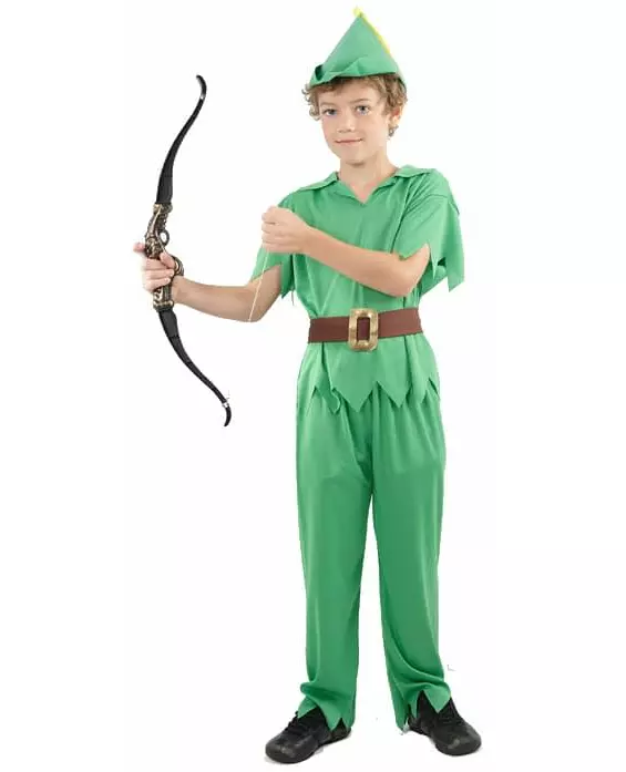 Veldig komfortabel, løs passform! Neverland-guttekostyme som inkluderer bukser, t-skjorte, lue og belte. De grønne buksene med elastisk linning er veldig komfortable. Den grønne toppen har V-hals, ermene og den nederste enden er spiss. Det brune beltet med gullspenne festes bak. Hatten er grønn i tykt stoff (resten er ikke inkludert). Dette veldig behagelige kostymet å ha på seg vil være perfekt til karneval, til et show eller en bursdag. Inkludert tilbehør: Topp, bukser, belte, lue. Materiale: 100 % polyester. Vedlikehold: Håndvaskbar.