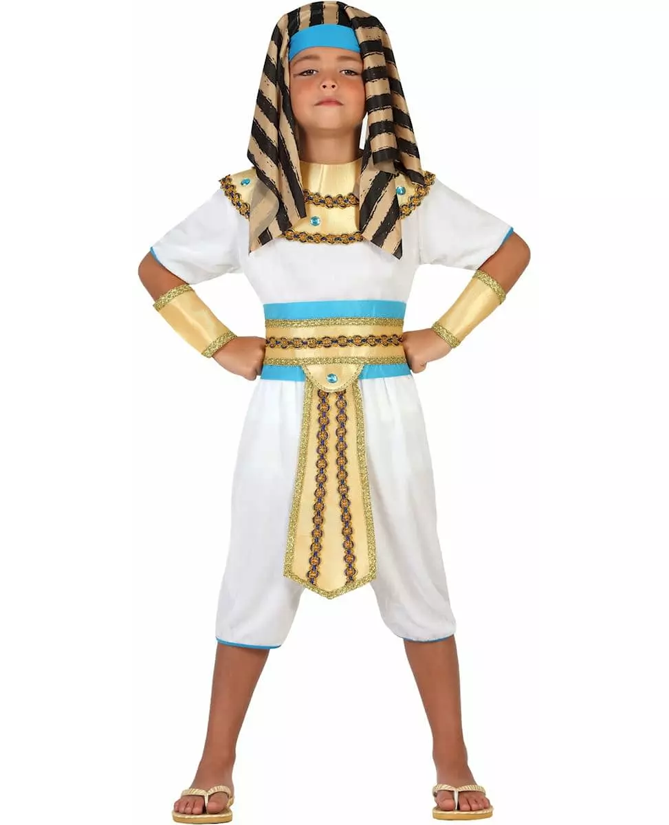En perfekt egypter! Dette egyptiske kostymet inkluderer et hodeplagg, en choker, en T-skjorte, et belte, to armbånd og et par capribukser (sko ikke inkludert). T-skjorten og capribuksene er laget av mykt hvitt fløyelsstoff, med blå kantbånd sydd på endene. Linningen på capribuksene er elastisk, og T-skjorten har borrelåsfester bak. Hodeplagget er stripete i brunt og gull. Det er knyttet bak hodet med et blått bånd. Et skumbånd hjelper til med å holde hodeplagget på plass slik at det ser ut som en ekte farao. Gullchokeren er dekorert med skinnende blå og gullkanter. Falske blå juveler er arrangert regelmessig. Den festes bak på nakken med borrelås. Gullarmbåndene med skinnende kant festes også med borrelåsfester. Beltet, som festes med borrelås, har en justerbar størrelse. Det er gull og blått, dekket med kanter i samme farge. Det har en hengende del mellom bena med en kant og en falsk blå juvel. Dette egyptiske kostymet vil være perfekt til karneval. Inkludert tilbehør: hodeplagg, halsvarmer, T-skjorte, belte, capribukser, 2 armbånd, Materiale: 100 % polyester,