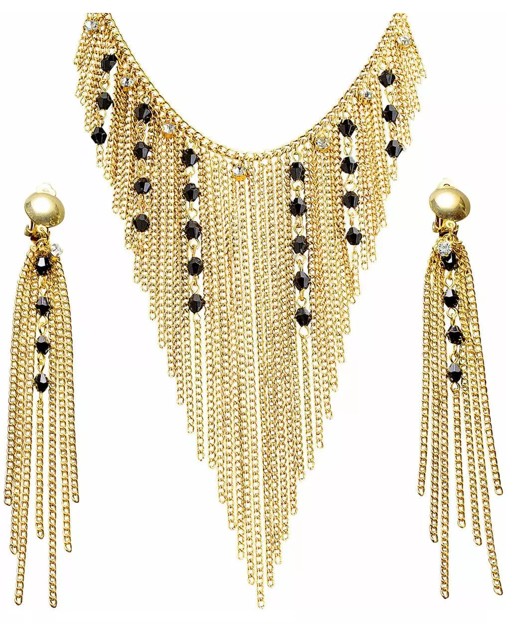 Blendende! Dette smykkesettet med Nilens dronning er for kvinner. Det inkluderer et halskjede og et par øredobber. Det matchende halskjedet og øredobbene er laget av gullbelagt metall. De består av flere kjeder, kuttet i en spiss for å fremheve halsutringningen din. Kjedene er dekorert med imiterte svarte edelstener. Dette settet med Nilens dronning-kjede og øredobber vil være perfekt for å pynte opp Kleopatra-kostymet ditt under karneval eller en fest med antikkens tema. Inkludert tilbehør: 2 øredobber 1 halskjede