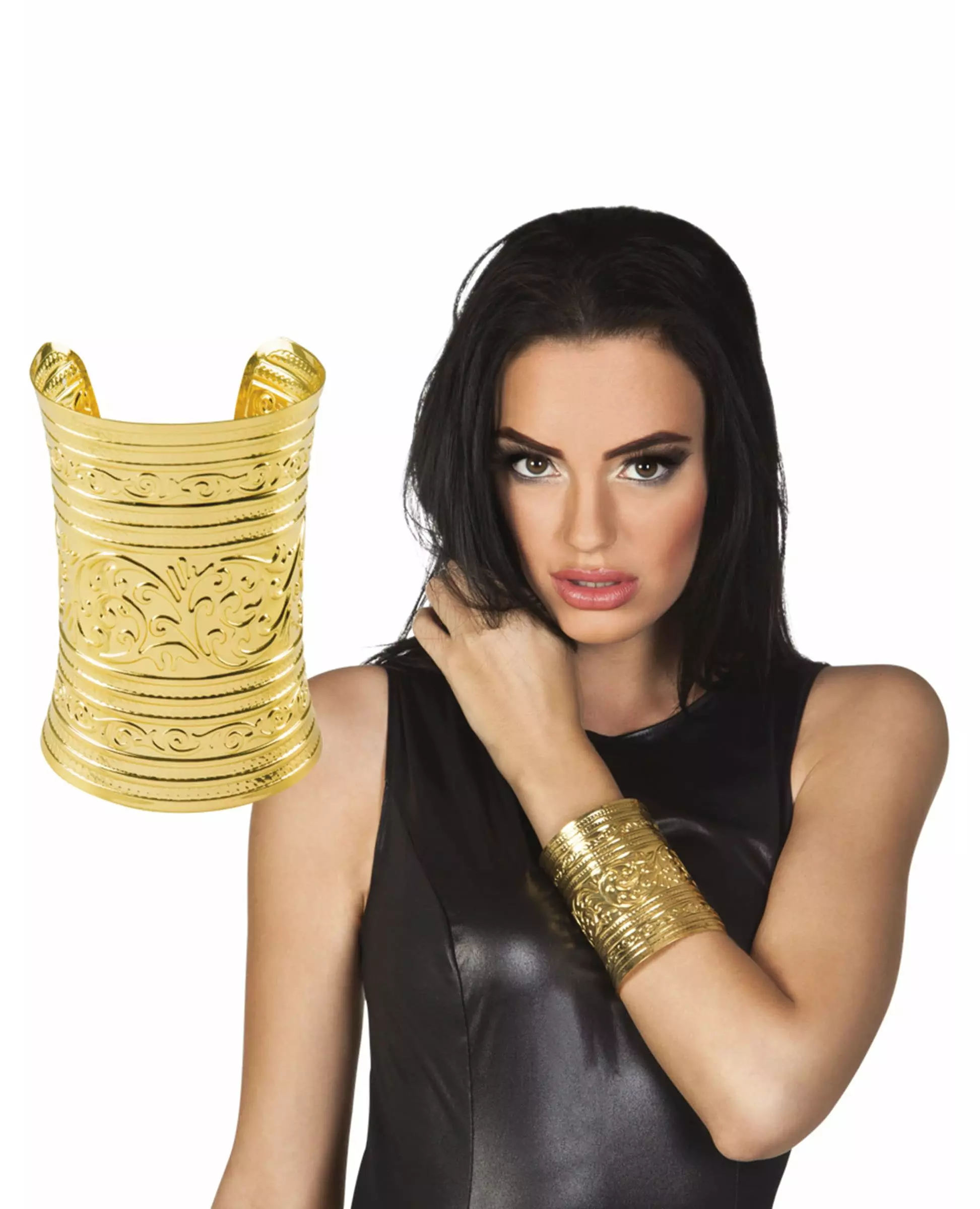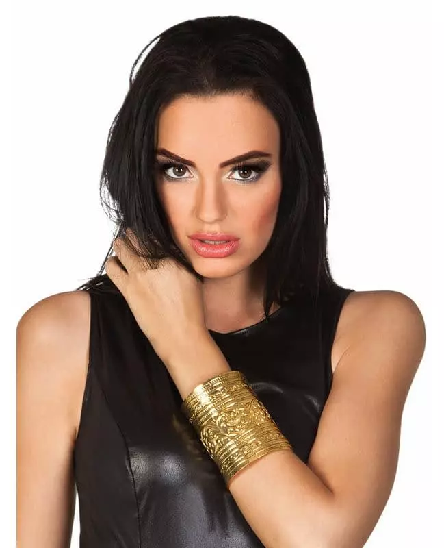 Føl deg som Kleopatra med denne vakre armbåndet. Dette armbåndet med Nilens dronning for kvinner er laget av gullbelagt metall. Det måler omtrent 10 cm i bredden. Dette gullmansjettet er gravert med arabesker som vil gi helheten volum. Dette tilbehøret vil være perfekt for å fullføre et egyptisk kostyme til karneval. Inkludert tilbehør: Armbånd