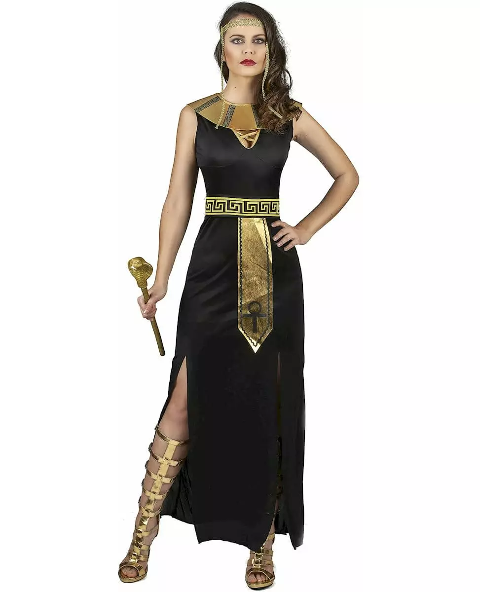 Et sprang inn i fortiden Dette egyptiske kostymet for kvinner inkluderer en kjole, en krage, et hodeplagg og et belte. Den lange, svarte kjolen er splittet på to steder fra knærne. V-halsen er dekorert med kryssende gullkanter. Kragen er festet med knytebånd og er trykt med egyptiske motiver. Hodeplagget, laget av gullflette, er elastisk og vil derfor passe de fleste hodestørrelser. Til slutt pynter beltet som knytes i ryggen midjen din perfekt. På en fest med gammel egyptisk tema eller enhver annen anledning til å pynte seg, vil dette Kleopatra-kostymet være ideelt. Inkludert tilbehør: Kjole Belte Krage Hodeplagg Materiale: 100 % polyester Stell: Håndvaskbar Målinformasjon: For størrelse S, kjole ca. 140 cm lang