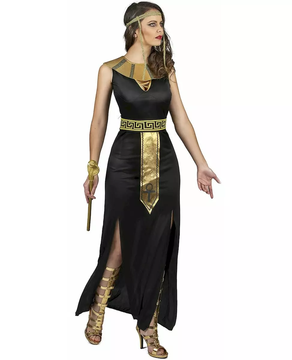 Et sprang inn i fortiden Dette egyptiske kostymet for kvinner inkluderer en kjole, en krage, et hodeplagg og et belte. Den lange, svarte kjolen er splittet på to steder fra knærne. V-halsen er dekorert med kryssende gullkanter. Kragen er festet med knytebånd og er trykt med egyptiske motiver. Hodeplagget, laget av gullflette, er elastisk og vil derfor passe de fleste hodestørrelser. Til slutt pynter beltet som knytes i ryggen midjen din perfekt. På en fest med gammel egyptisk tema eller enhver annen anledning til å pynte seg, vil dette Kleopatra-kostymet være ideelt. Inkludert tilbehør: Kjole Belte Krage Hodeplagg Materiale: 100 % polyester Stell: Håndvaskbar Målinformasjon: For størrelse S, kjole ca. 140 cm lang