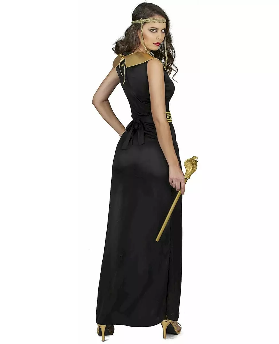 Et sprang inn i fortiden Dette egyptiske kostymet for kvinner inkluderer en kjole, en krage, et hodeplagg og et belte. Den lange, svarte kjolen er splittet på to steder fra knærne. V-halsen er dekorert med kryssende gullkanter. Kragen er festet med knytebånd og er trykt med egyptiske motiver. Hodeplagget, laget av gullflette, er elastisk og vil derfor passe de fleste hodestørrelser. Til slutt pynter beltet som knytes i ryggen midjen din perfekt. På en fest med gammel egyptisk tema eller enhver annen anledning til å pynte seg, vil dette Kleopatra-kostymet være ideelt. Inkludert tilbehør: Kjole Belte Krage Hodeplagg Materiale: 100 % polyester Stell: Håndvaskbar Målinformasjon: For størrelse S, kjole ca. 140 cm lang