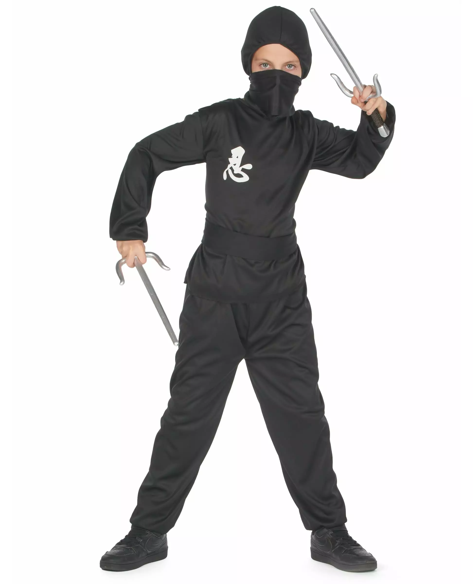 Med ninjamerke! Dette ninja-kommandokostymet for gutter består av svarte bukser med elastisk midje, en langermet t-skjorte med ninjamerket preget på brystet, et svart belte og en hette (sabel og sokker er ikke inkludert). Komfortabelt og lett, dette kostymet vil være perfekt for karneval, et show, en bursdagsfest eller andre utkledningsarrangementer. Inkludert tilbehør: Topp, bukser, belte, hette, materiale: 100 % polyester, pleie: renseri, kjemisk rens,
