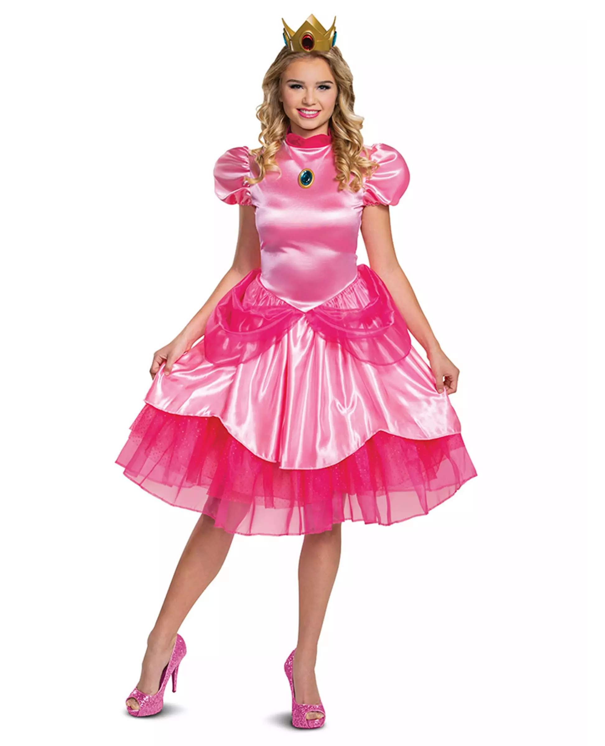 Bli den ikoniske Prinsesse Peach med dette deluxe Nintendo™-lisensierte kostymet for kvinner. Dette offisielt lisensierte Nintendo® Deluxe Prinsesse Peach-kostymet er for kvinner. Det inkluderer kjole og krone (sko og halskjede er ikke inkludert). Kjolen er rosa med puffede skuldre og en rund hals. En fuskestein og en liten mørkerosa krage pryder kragen på antrekket. Underskjørtet har også mørkere rosa tyllpartier. Kom og ta på deg den juvelbesatte kronen! Gjør dette offisielt lisensierte Nintendo® Deluxe Prinsesse Peach-kostymet til en parasoll eller en gul stjerne! Inkludert tilbehør: Kjolekrone Materiale: 100 % polyester