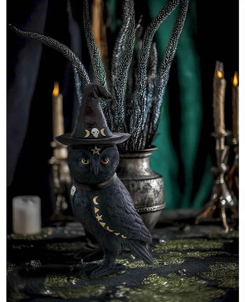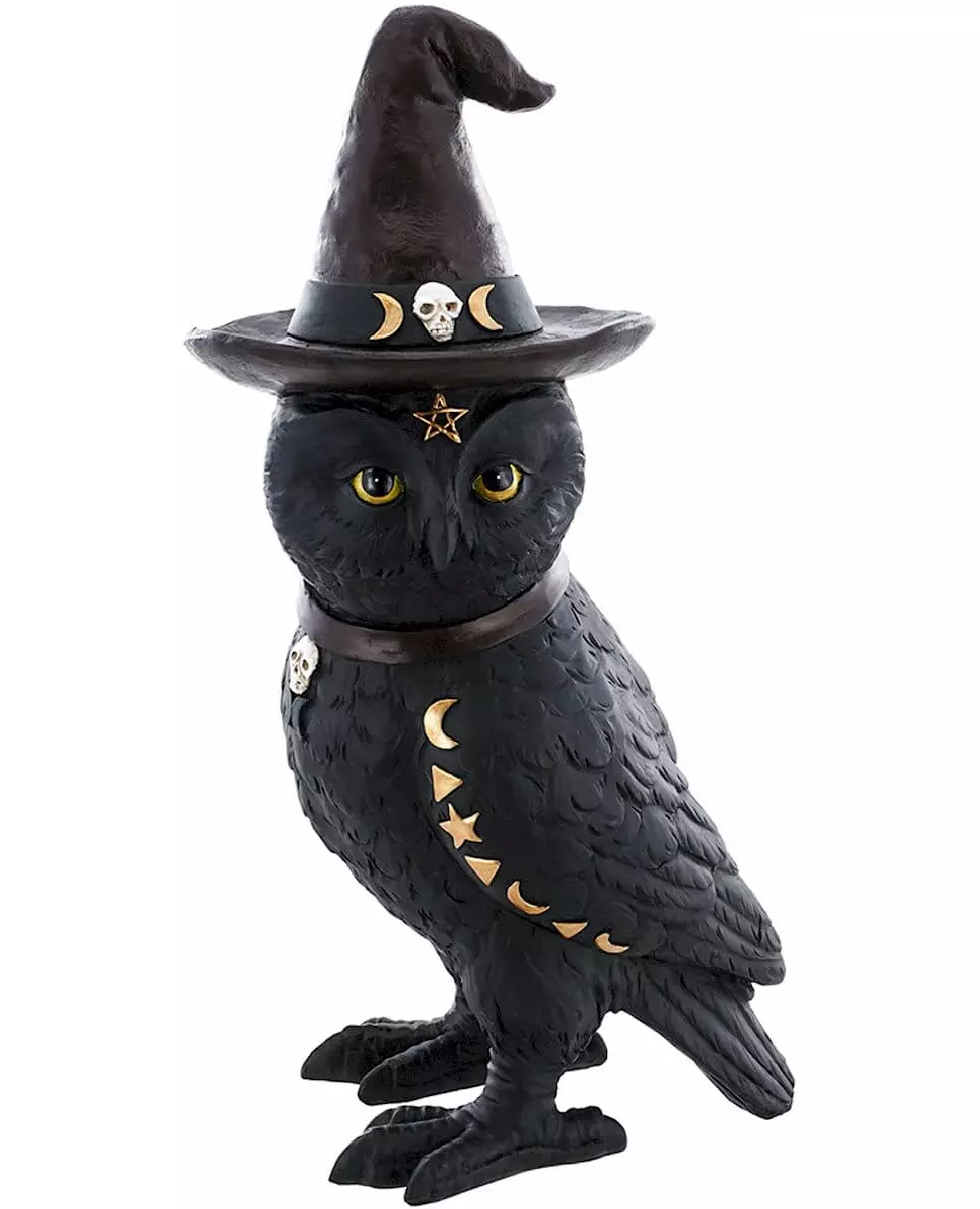 En mystisk og magisk dekorasjon med denne trollmannsuglen! Denne dekorasjonen tilsvarer en trollmannsugle. Den måler omtrent 31 cm i høyden. Den er svart overalt, har små gule mønstre (måner, stjerner) samt en falsk hvit hodeskalle på hatten og bysten. Med sine gylne øyne vil du få inntrykk av at den skanner omgivelsene...! Denne trollmannsuglen vil være ideell for å fullføre din innvendige eller utvendige dekorasjon til Halloween! Inkludert tilbehør: 1 trollmannsugle Materiale: Polyresin Vedlikehold: Ikke vask