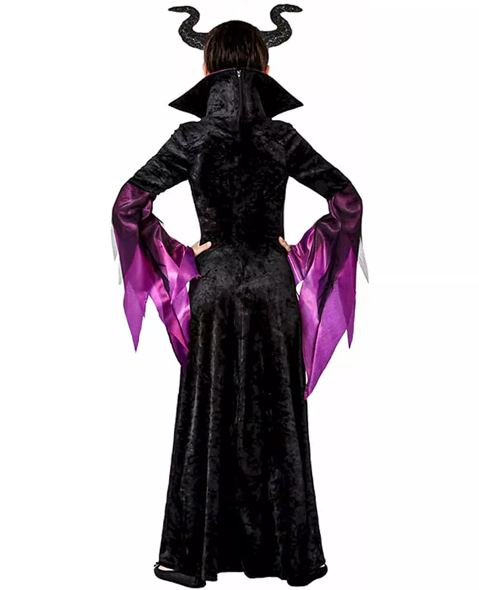 Bli en ond dronning i denne svarte kjolen. Dette onde dronningkostymet for jenter består av en kjole (hodeplagg ikke inkludert). Den lange kjolen er svart og lilla. Den har svært utsvingte lange ermer og en høy lilla krage. Denne heksekjolen vil være perfekt for å spille superskurker til Halloween. Materiale: polyester. Inkludert tilbehør: Klespleie: Håndvask.