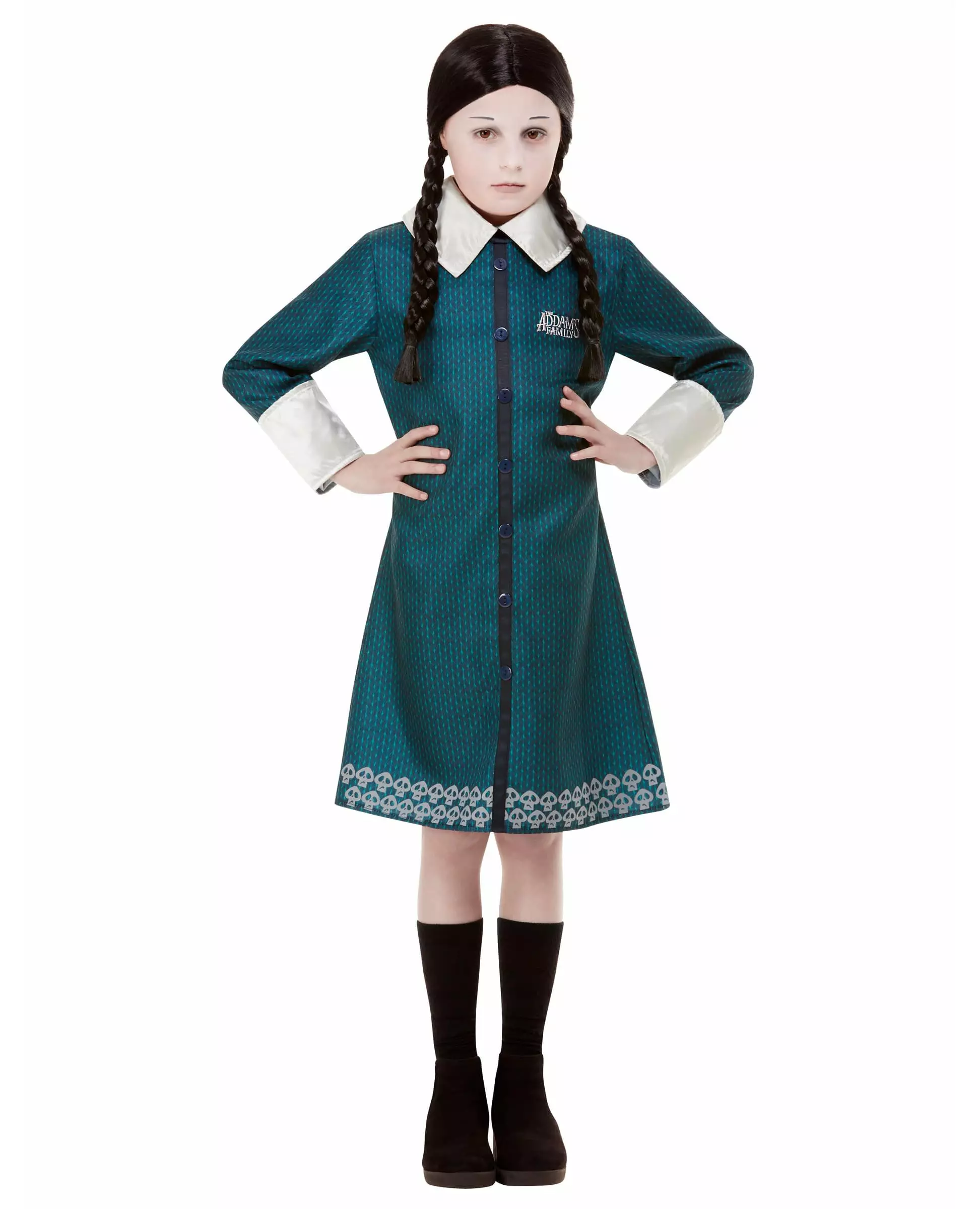 Bli en Wednesday-kostyme til Halloween! Dette offisielt lisensierte Wednesday-kostymet er Addams-familien™ og består av en kjole og en parykk (sko og sokker er ikke inkludert). Kjolen er blå med en svart stripe i midten dekorert med knapper. Ermene er lange og kanten er hvit. To linjer med hodeskaller dekorerer bunnen av kjolen. Den har inskripsjonen «Addams-familien». Kostymet kompletteres med Wednesdays parykk. Den er svart og danner to fletter på hver side av hodet. Dette Wednesday Addams-familien™-kostymet er perfekt for å kle seg ut på Halloween-kvelden! Materiale: POLY (100,0 %). Inkludert tilbehør: Parykk. Stell: Håndvask.