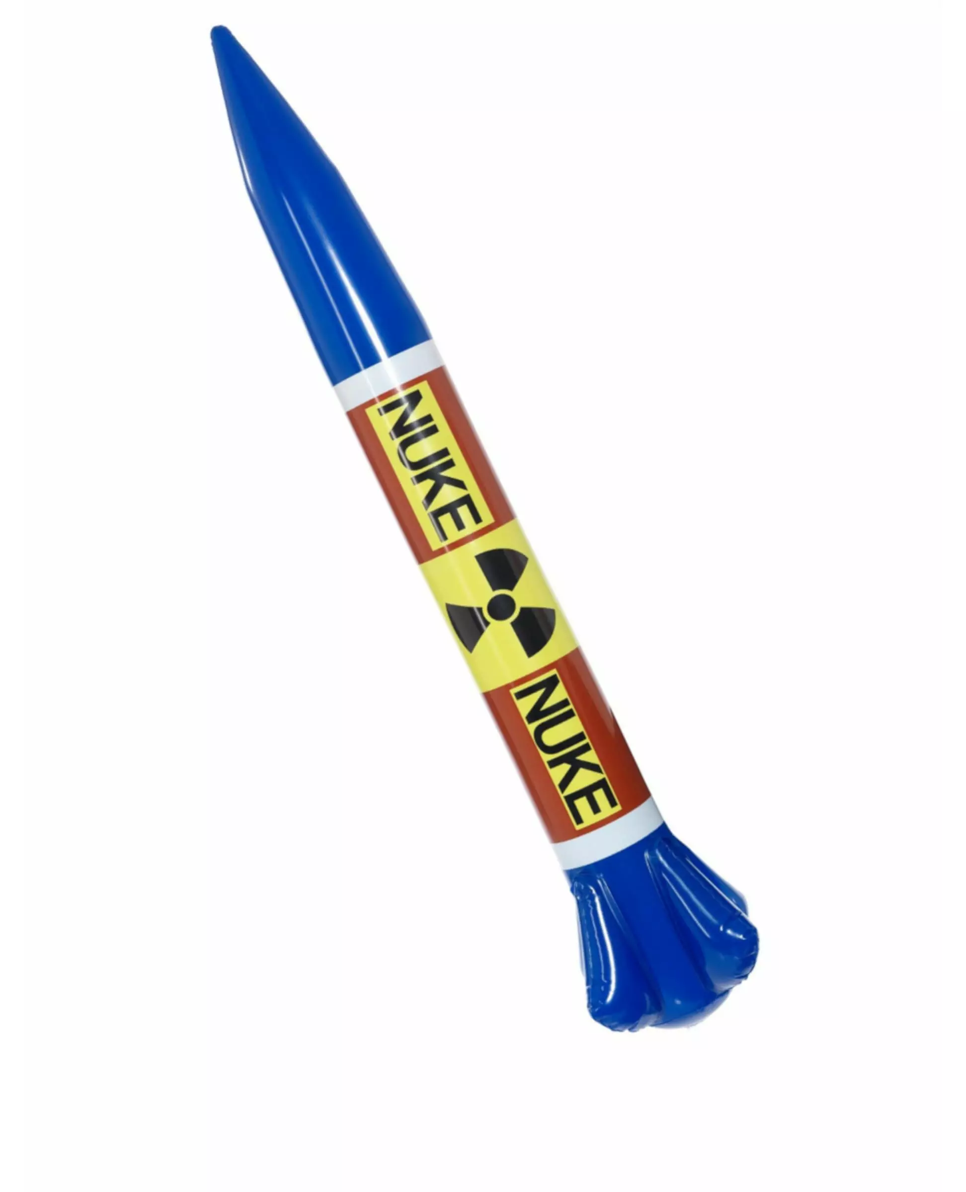 Gi kostymet ditt et originalt preg. Dette tilbehøret forestiller et atomvåpenmissil. Det er oppblåsbart og måler omtrent 87 x 13 cm. Det er blått, med en atomvåpenlogo og ordet «atomvåpen». Dette falske missilet vil være perfekt for å fullføre din militære eller politiske forkledning til et kostymefest. Inkludert tilbehør: Oppblåsbart missil. Materiale: 100 % PVC.
