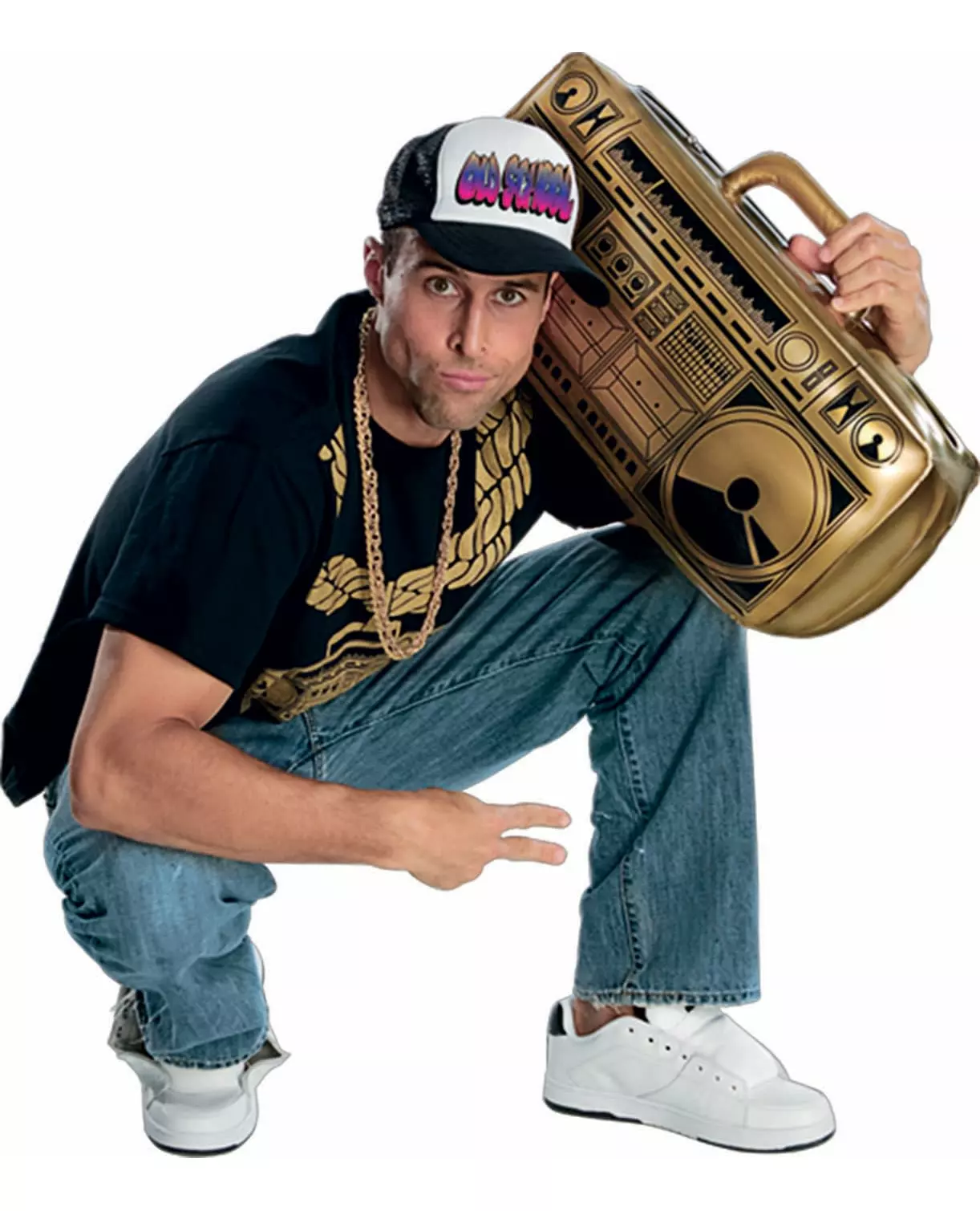 Bling-bling til siste liten Denne oppblåsbare radioen er i gull og svart. Den måler omtrent 20 x 50 cm. Dette tilbehøret vil være ideelt for å fullføre det amerikanske rapperkostymet ditt og gi det hele et snev av glitter! Inkludert tilbehør: Oppblåsbar radio