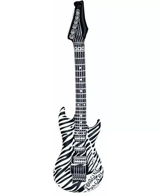 Koble til gitarene! Den oppblåsbare elektriske gitaren er hvit med sebrastriper og ganske realistisk. Den måler omtrent 110 cm og er veldig lett. Ideelt tilbehør for å fullføre et rocker- eller rockesangerkostyme. Muntlig oppblåsing anbefales – oppblåsing med pumpe anbefales ikke. Inkludert tilbehør: Oppblåsbar gitar. Materiale: Plast.