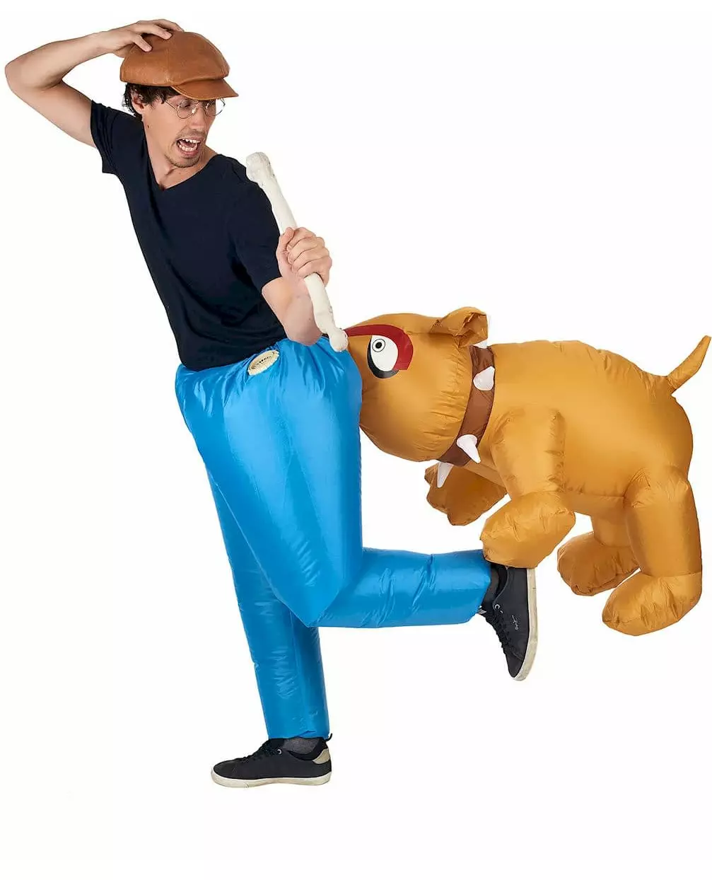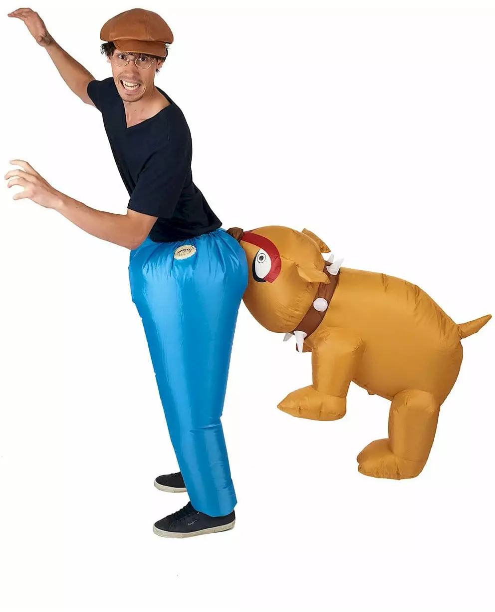 Pass på rumpa! Dette oppblåsbare kostymet er formet som et par blå bukser med en vill bulldog festet til dem. Det inkluderer en kjeledress, samt et oppblåsingssystem inkludert en vifte, en eske for 4 AA-batterier (ikke inkludert) og en kabel som forbinder de to elementene. Stoffet i midjen og anklene er elastisk for å sikre nødvendig tetthet slik at luften ikke slipper ut (NB: Det oppblåsbare kostymet må opprettholdes under hele bruken av kostymet). Se forklarende instruksjoner på innsiden. Aktiver viften for å få et perfekt resultat under kostymefester med temaet hån og latter! Inkludert tilbehør: Kjeledress, viftesystem. Materiale: 100 % polyester.