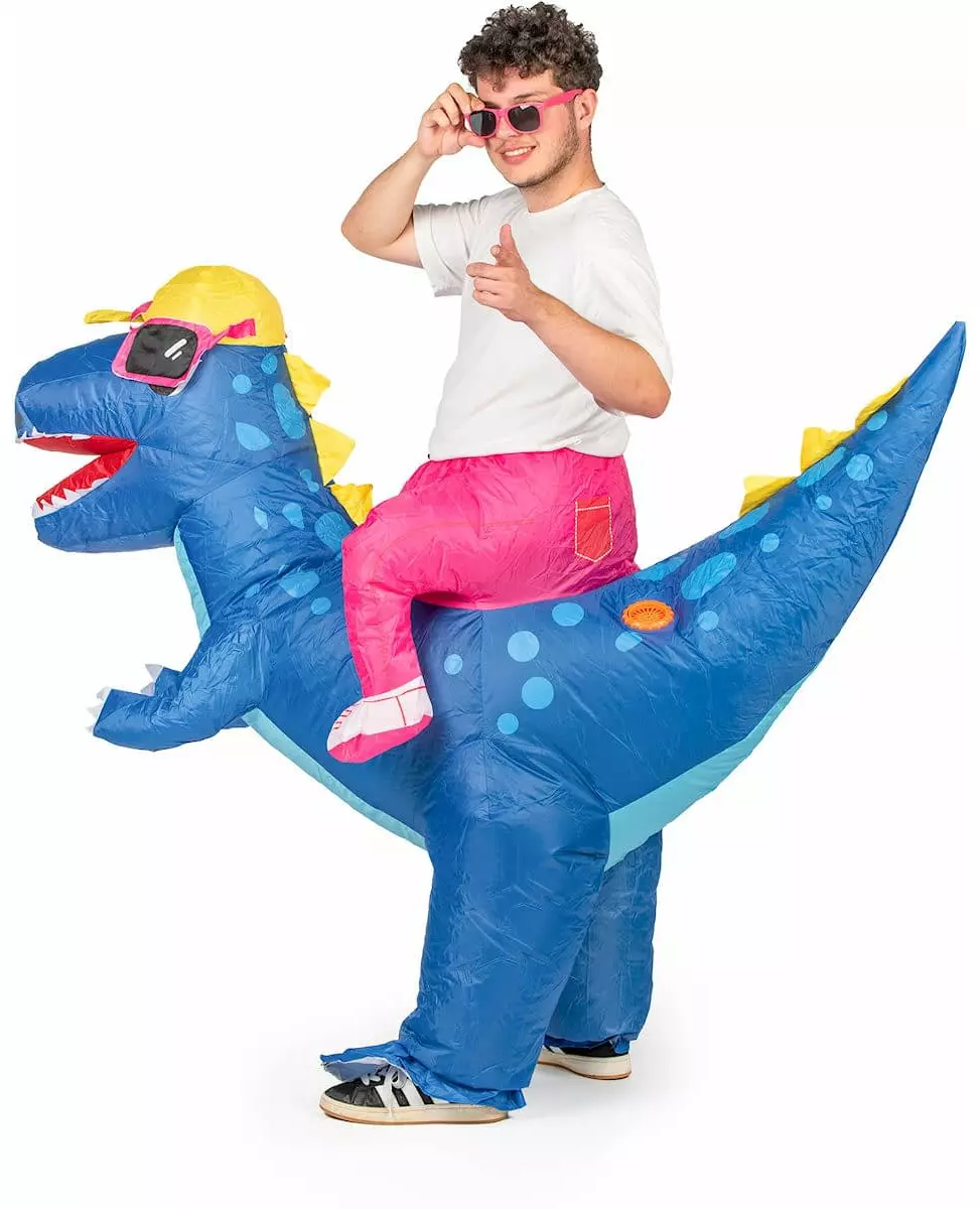 Bli med på et eventyr på ryggen av en dinosaur til karnevalet! Dette oppblåsbare dinosaurkostymet er for voksne. Det inkluderer en jumpsuit og en innebygd vifte. Dette kostymet gir illusjonen av å ri på en legendarisk skapning. Dinosauren, i knallblått, er utstyrt med solbriller og en gul caps for et morsomt og uvanlig utseende. Kostymet fungerer takket være en innebygd vifte med AA-batterier (ikke inkludert) som lar dinosauren ta form på bare noen få øyeblikk. Beina dine passer inn i dinosaurens bakbein, mens kostymets kunstige bein gir illusjonen om at du faktisk rir på det forhistoriske dyret. Med justerbare snorer i livet passer dette kostymet perfekt til kroppen din, noe som sikrer en komfortabel passform gjennom hele festen. Dette dinosaurkostymet vil være perfekt for karneval eller en temafest!. Inkludert tilbehør: 1 kostyme 1 vifte Materiale: 100 % polyester Vedlikehold: Håndvask