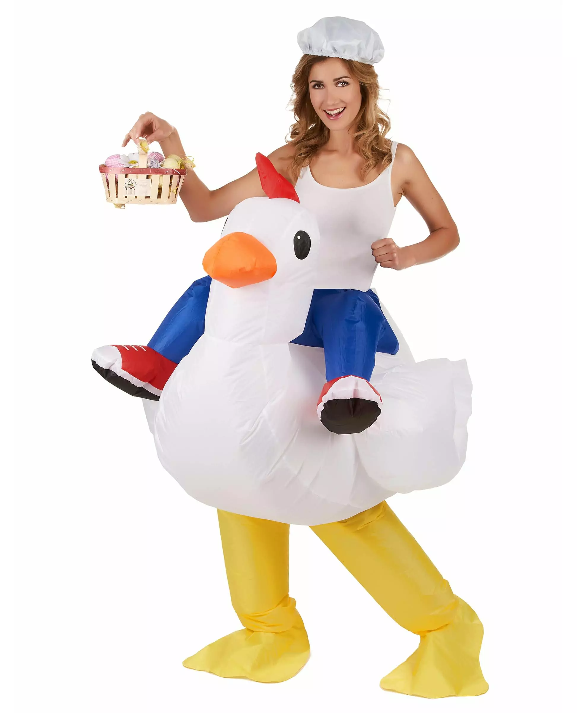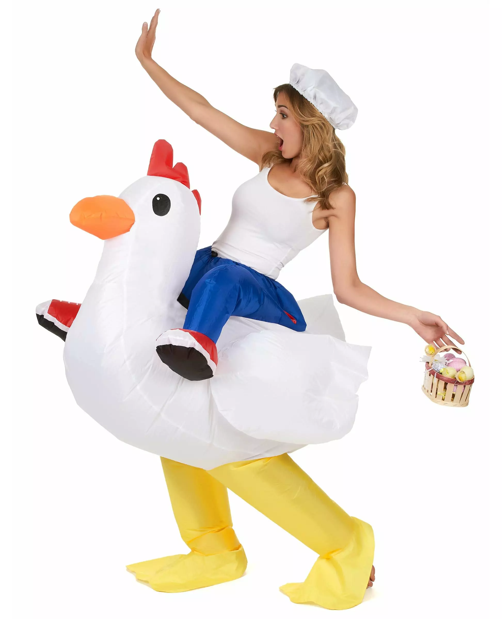 Du er perfekt! Dette oppblåsbare kyllingkostymet for voksne inkluderer en jumpsuit, et oppblåsingssystem og et hodeplagg (kurv og tanktopp er ikke inkludert). Jumpsuiten i plastbelagt stoff er formet som en flott hvit kylling, som du er rytteren på. Den strammes i livet med en snor med et trykklåsesystem. Oppblåsningssystemet inkluderer en vifte og en eske som inneholder 4 AA-batterier (ikke inkludert) som du må holde aktivert under hele bruken av kostymet. Den vil konstant sende luft inn i kostymet for å holde det oppblåst. For mer informasjon, se instruksjonene som følger med kostymet. Hodeplagget består av et hårnett som dekker hodet ditt med et skinn av et eggeskall. Nok til å skape moro blant alle vennene dine under et kostymeløp eller til en hvilken som helst annen festanledning!. Inkludert tilbehør: Jumpsuit Hodeplagg Oppblåsbart system Materiale: 100 % polyester Stell: Håndvaskbar
