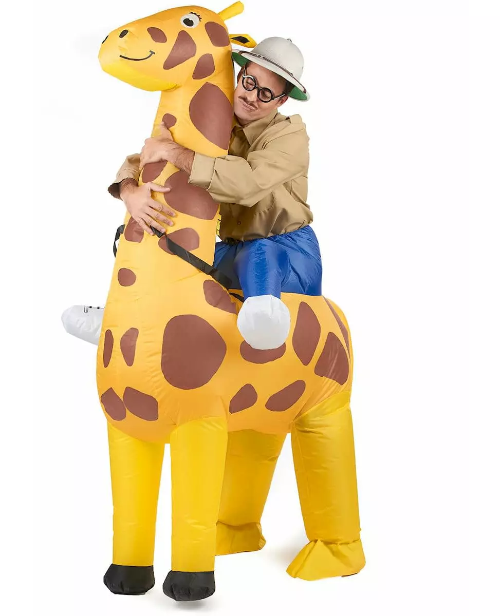 Ta turen til himmels! Dette kostymet for voksne er en mann på en sjiraffrygg. Kostymet tas på som en bukse som justeres til størrelsen din takket være en snøring. Sjiraffen er oppblåsbar og ser ut til å bære mannen på ryggen. To svarte bånd er inkludert, slik at du kan holde sjiraffens hode og utforske savannen, mens du vokser i høyden, på ryggen til dette majestetiske dyret! Med dette kostymet kan du forvandle deg til en oppdagelsesreisende på safari på savannen på ryggen av din langhalsede ridedyr under kostymefester, kostymeløp eller til karnevalet! Dette kostymet blåses opp ved hjelp av en vifte og en boks. Viften på baksiden er koblet til batteriboksen (4 AA-batterier er ikke inkludert). For å blåse opp kostymet, trykker du bare på AV/PÅ-knappen. Inkludert tilbehør: Jumpsuit med boks og vifte Materiale: 100 % polyester 100 % polyester Pleie: Håndvask