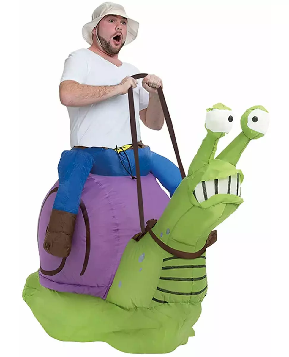 Et unikt kostyme! Dette hysterisk morsomme oppblåsbare kostymet forvandler deg til en gigantisk sneglerytter, klar til å erobre festen i et overraskende sakte tempo! Kostymet inkluderer en jumpsuit med et oppblåsingssystem som inkluderer en vifte, et etui for AA-batterier (ikke inkludert) og en kabel som forbinder de to elementene for å holde sneglen oppblåst. Jumpsuiten har en rytter som rir på en grønn og lilla snegle med morsomme øyne, noe som skaper en helt uvanlig visuell effekt. Stoffet er elastikk i midjen og anklene for å holde luften inne og sikre kontinuerlig oppblåsing. Ideelt for utkledningsfester med et humor- eller håntema, vil dette kostymet garantere en overraskende effekt og mye latter! Inkludert tilbehør: 1 jumpsuit med batteriboks Materiale: 100 % polyester Vedlikehold: Håndvask
