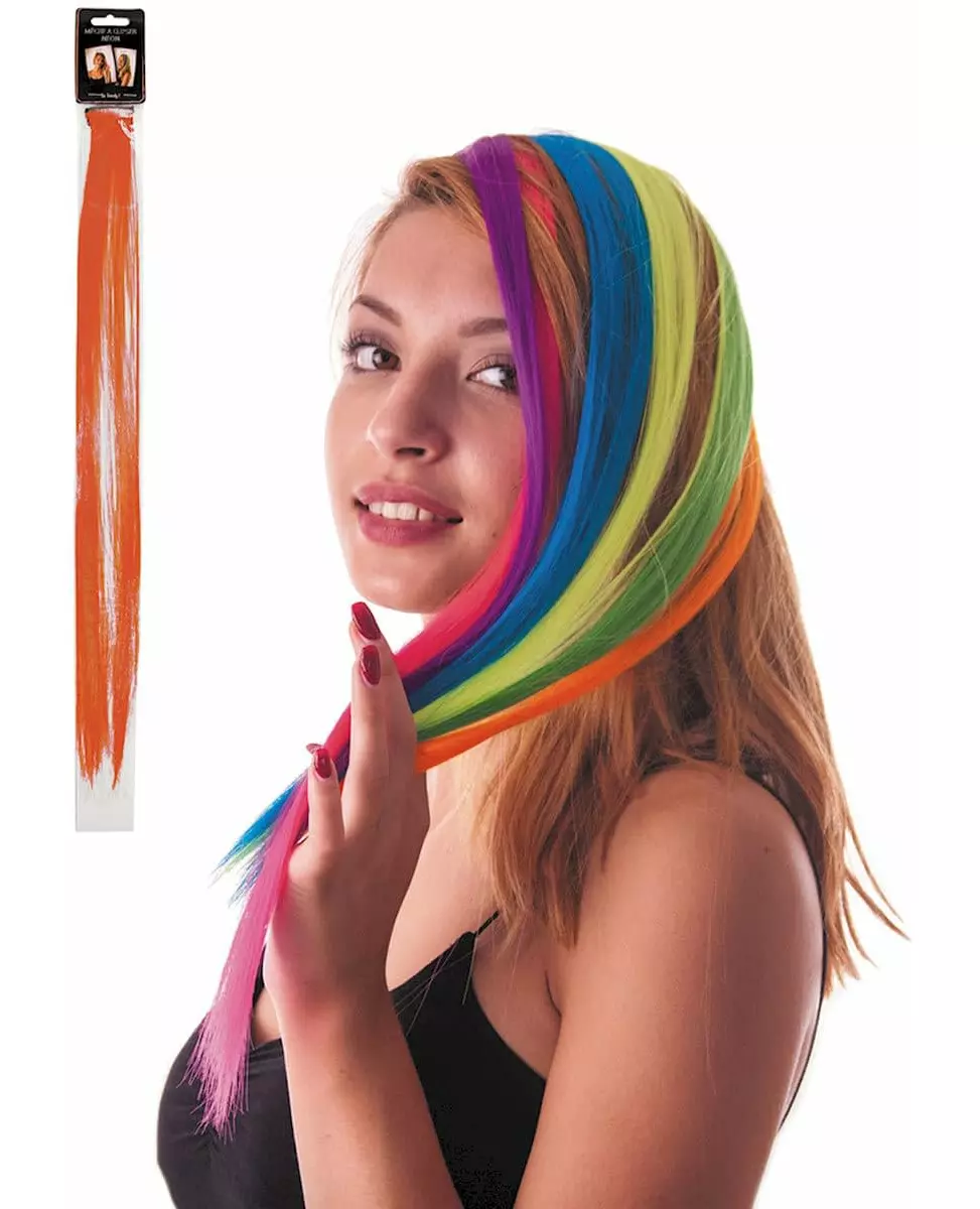 Endre stilen din med en klips! Denne pakken inneholder én parykk med klips i neonoransje. Den er laget av syntetisk hår og måler omtrent 50 x 4 cm. Fullfør den oransje parykken din med de andre parykkene vi tilbyr for å skape en unik stil! Denne fargerike parykken vil være ideell for en neonfest! Inkludert tilbehør: 1 parykk Materiale: Syntetisk 100 % polyester 100 % polyester