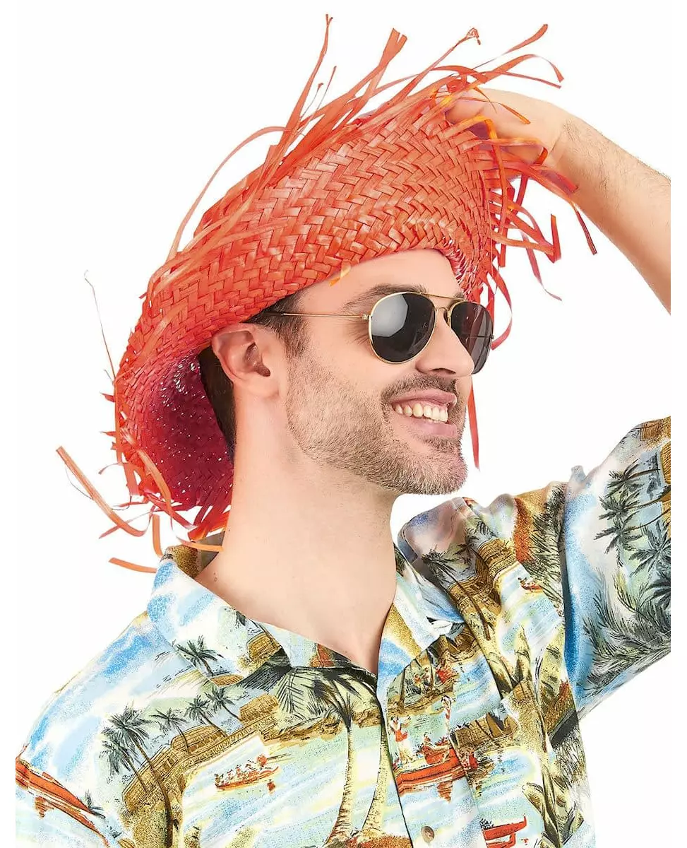 Vi vil ikke miste deg av syne! Denne hawaiiske hatten er for voksne og er mørk oransje i fargen. Den passer til hodeomkretser på omtrent 54 cm. Kantene har frynser som ideelt sett beskytter deg mot solen for en sommerfest eller enhver annen anledning til å pynte deg. Inkludert tilbehør: Hatt Materiale: Strå