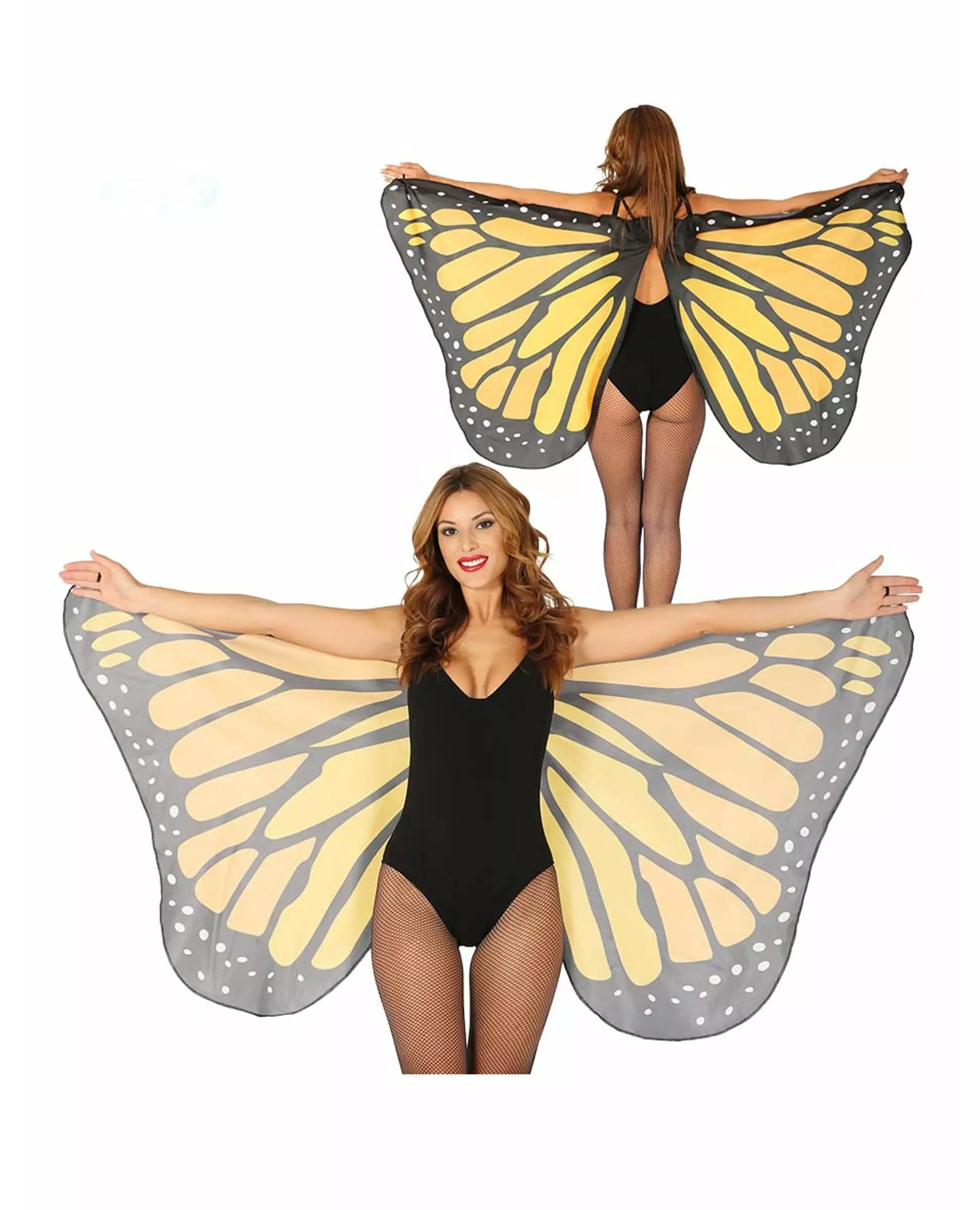 Bli en pen sommerfugl med disse fargerike vingene. Disse sommerfuglvingene er for voksne. De er oransje og svarte, med hvite prikker. De måler omtrent 170 x 80 cm og bæres med stropper. De vil være perfekte for å fullføre et sommerfuglkostyme til karneval. Inkludert tilbehør: Vinger. Materiale: 100 % polyester.