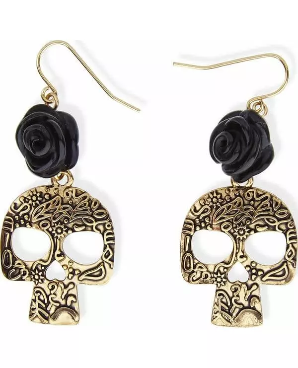 Feir de dødes dag Disse metalliske øredobbene for voksne har hodeskaller i calavera-stil med en svart plastrose på toppen. Disse dråpeøredobbene måler omtrent 5 cm i lengde. De krever hull i ørene. Disse smykkene vil være perfekte for å fullføre ditt elegante skjelettantrekk til Halloween. Copyright Widmann SRL. Inkludert tilbehør: 2 øredobber