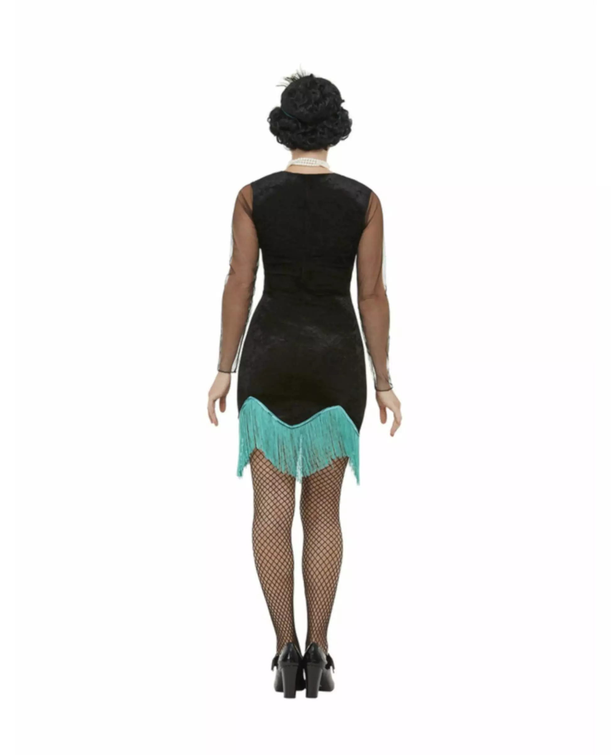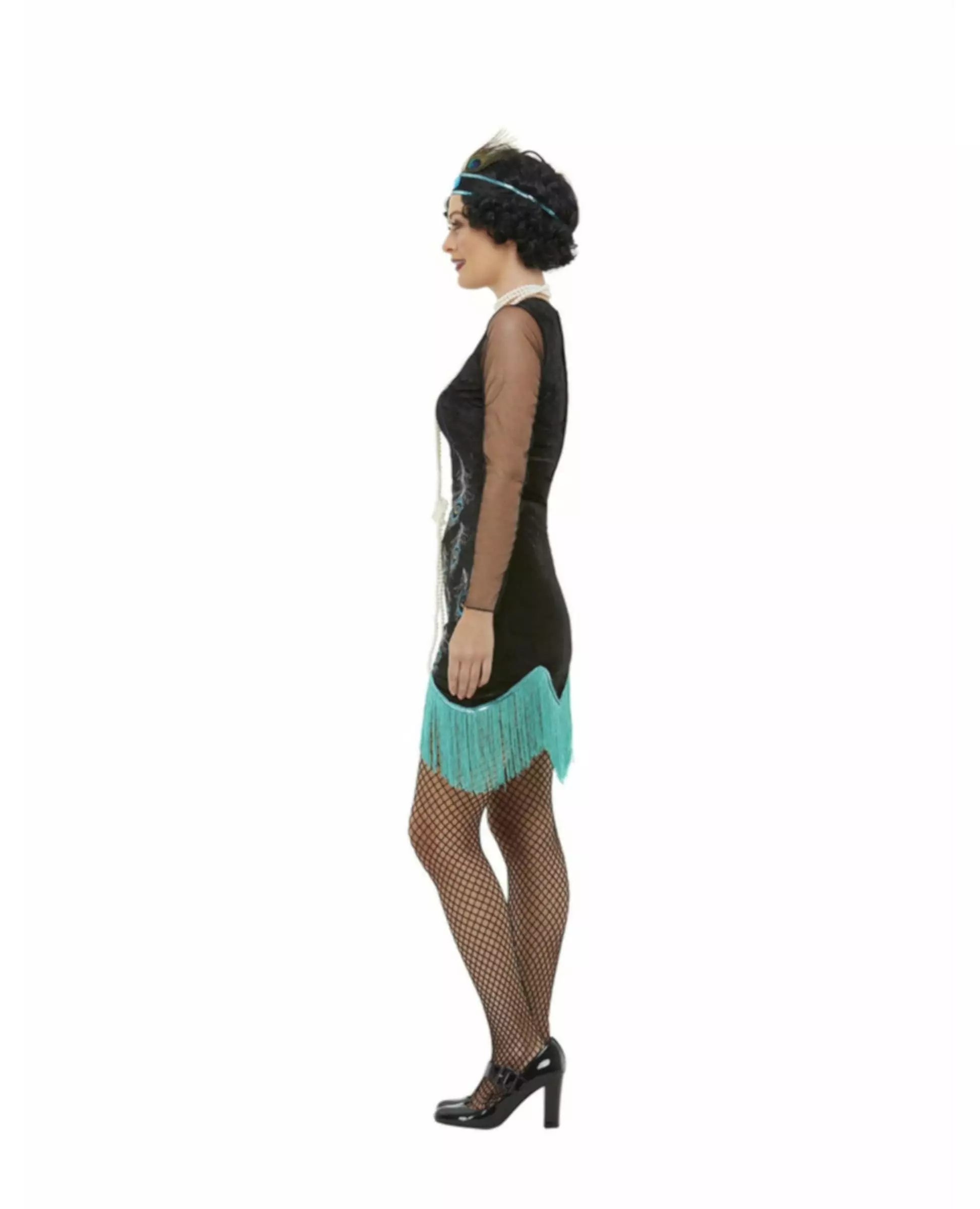 Kom i 20-tallsmodus med dette fantastiske kostymet. Dette Charleston-kostymet for kvinner består av en kjole og et pannebånd (halskjede, sigarettrør, boa, strømpebukser og sko er ikke inkludert). Den korte kjolen har svart fløyelseffekt. Kragen og ermene er laget av et svart slør. På bysten kan vi se et design som representerer hodet til en påfugl med fjær under. Kjolen avsluttes med lange blå frynser. Pannebåndet er svart med blå kanter og en falsk stein. Dette kostymet vil være perfekt for å gjøre deg mest mulig elegant på en Charleston-kveld. Inkludert tilbehør: Kjolepannebånd Materiale: 100 % polyester Pleie: Håndvask