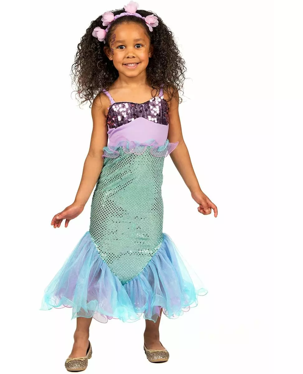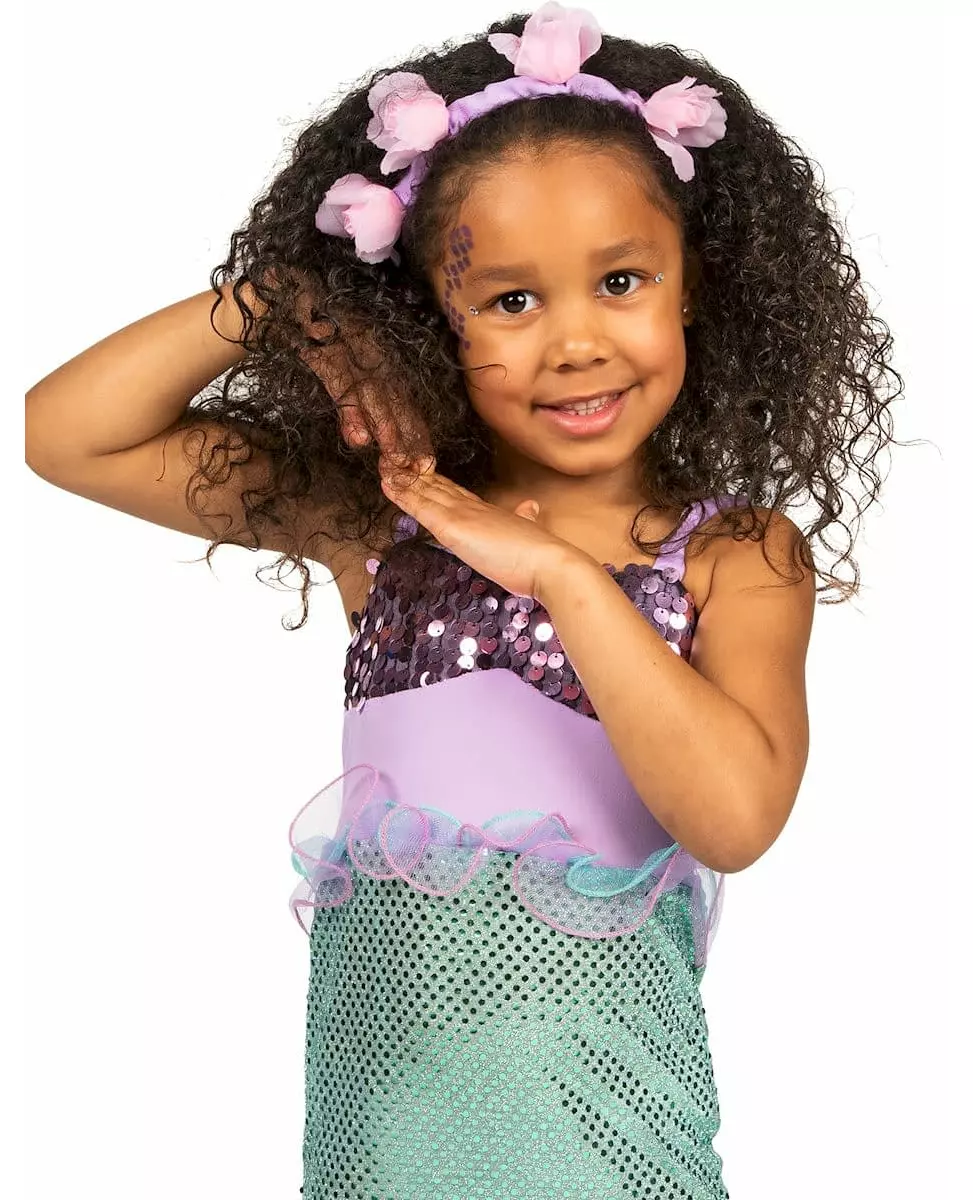 En liten havfrue som stråler! Dette paljettbesatte havfruekostymet for jenter består av en kjole og et pannebånd. Kjolen er dekket av lilla paljetter rundt brystet. De dominerende fargene er blå og lilla. Den glir lett på over hodet. Tynne, elastiske stropper sørger for at den holder seg på plass. Nederdelen av kjolen har finner og er laget av lag med blå og lilla tyll. Resten av kjolen er tettsittende for å gi barnet ditt utseendet til et sjødyr. Pannebåndet er lilla og elastisk. En borrelåsfest lar deg justere pannebåndet til enhver frisyre. På forsiden av tilbehøret er det sydd fire rosa blomster. På en bursdagsfest eller til karneval vil datteren din være den mest bedårende havfruen!. Inkludert tilbehør: Kjole Pannebånd Materiale: 100 % polyester Stell: For hånd
