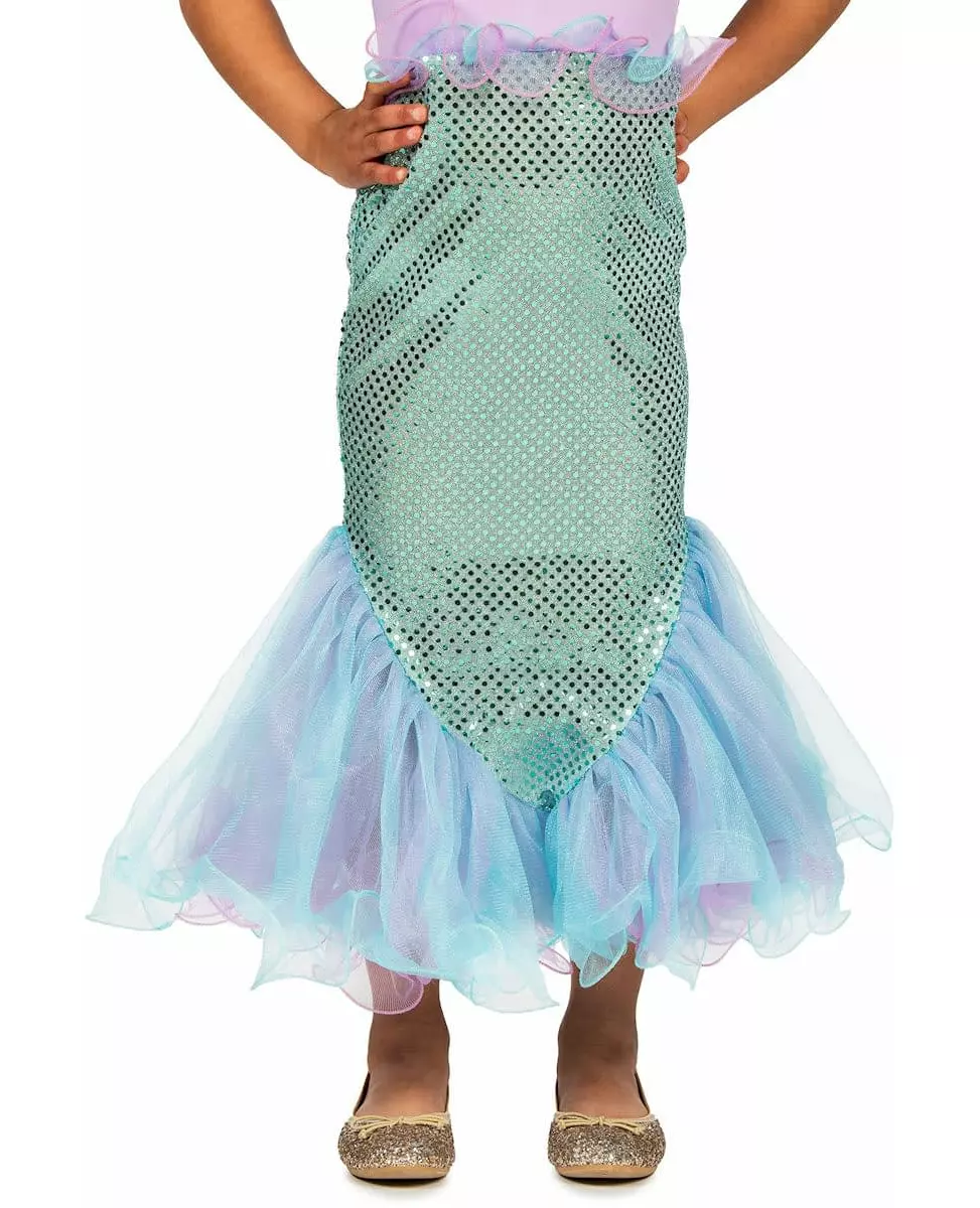 En liten havfrue som stråler! Dette paljettbesatte havfruekostymet for jenter består av en kjole og et pannebånd. Kjolen er dekket av lilla paljetter rundt brystet. De dominerende fargene er blå og lilla. Den glir lett på over hodet. Tynne, elastiske stropper sørger for at den holder seg på plass. Nederdelen av kjolen har finner og er laget av lag med blå og lilla tyll. Resten av kjolen er tettsittende for å gi barnet ditt utseendet til et sjødyr. Pannebåndet er lilla og elastisk. En borrelåsfest lar deg justere pannebåndet til enhver frisyre.   På forsiden av tilbehøret er det sydd fire rosa blomster.   På en bursdagsfest eller til karneval vil datteren din være den mest bedårende havfruen!. Inkludert tilbehør: Kjole Pannebånd Materiale: 100 % polyester Stell: For hånd