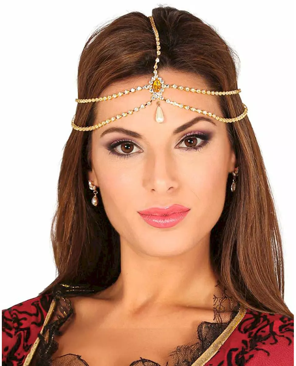 Et praktfullt hodeplagg som vil forbedre utseendet ditt på festene dine! Dette hodeplagget i plast er for kvinner. Det er gullbelagt og har en falsk stein i midten som vil falle ned på pannen din. Fem gullfargede kjeder er koblet til dette anhenget. Dette falske smykket vil være perfekt for å fullføre et Charleston- eller orientalsk antrekk på kostymefesten din!. Inkludert tilbehør: Hodeplagg Materiale: Plast