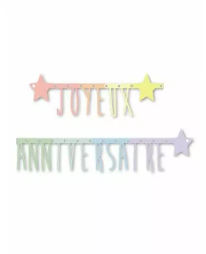 En søt bursdag! Denne bursdagsgirlanderen måler 160 cm lang og 10 cm høy. Den inkluderer hengslede pappklistremerker som danner inskripsjonen «Gratulerer med dagen» omgitt av fine stjerner. Den er i pastellfarger. Den vil være ideell for en vellykket bursdagsdekorasjon!. Inkludert tilbehør: Girlander Materiale: Papp