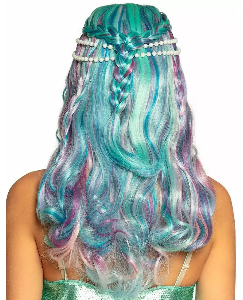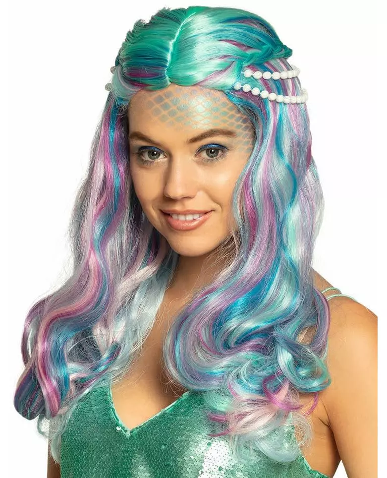 En fargerik havfrue Denne havfrueparykken for kvinner er laget av langt grønt syntetisk hår med pene lilla, blå og hvite detaljer. To små fletter knyttet sammen og to rader med perler er på parykken for å gi den enda mer sjarm. Med denne parykken får du et mer enn realistisk kostyme til en havfrue-temafest. Inkludert tilbehør: Parykk Materiale: 100 % polypropylen