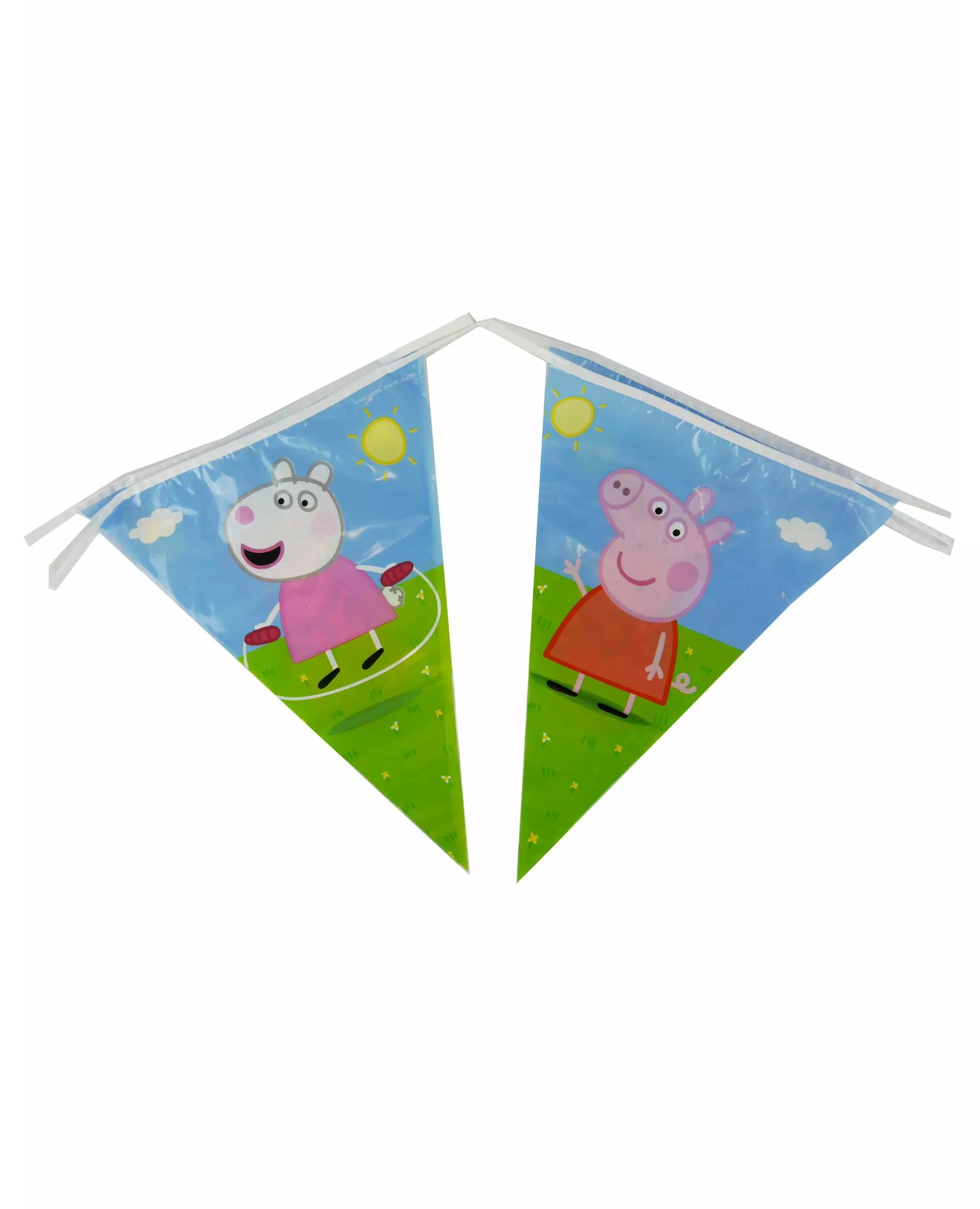 Bli med Peppa på eventyrene hennes. Denne offisielt lisensierte Peppa Gris-vimplen er laget av plast og er omtrent 270 cm lang. Denne vimplen er laget av fargerike trekantede vimpler. De forestiller Peppa og vennene hennes foran et grønt og solrikt landskap. Denne vimplen vil være perfekt for å fullføre interiøret ditt. For en bursdagsfest for barnet ditt som er en fan av Peppa Gris-tegneserien! Inkludert tilbehør: 1 girlander. Materiale: Plast. Målinformasjon: 270 cm.