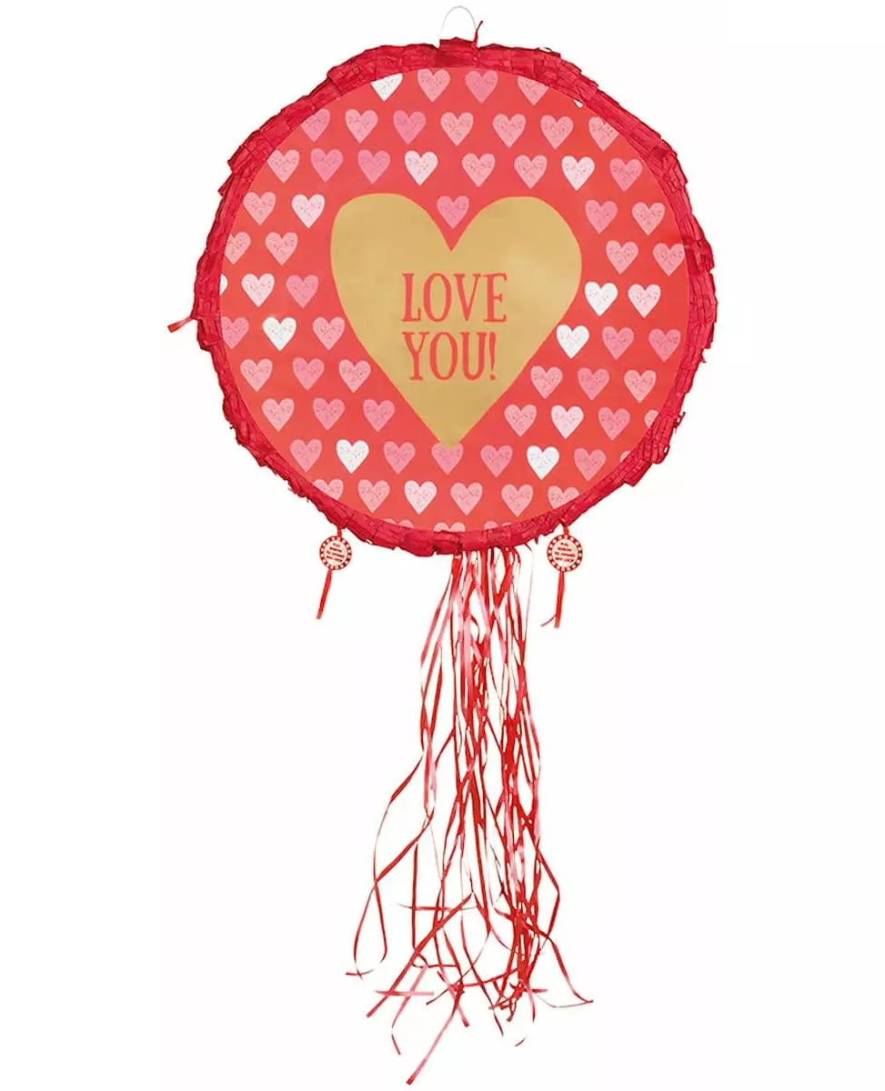 Enda mer atmosfære! Denne sammenleggbare piñataen er en lett å ødelegge. Den er rund, rød i fargen og har mønstre av små hjerter med et stort hjerte i midten som inneholder inskripsjonen «Elsker deg!». Den måler omtrent 40 cm. Den kan fylles med hva du vil (små leker, godteri, konfetti osv.) takket være en liten åpning. Målet med spillet er å bytte på å slå på den mens man har bind for øynene med en pinne for å knuse piñataen og finne det som er inni. Denne piñataen vil være perfekt for å ha det gøy på en bursdag eller en kjærlighetstemafest! Inkludert tilbehør: 1 piñata Materiale: Papp