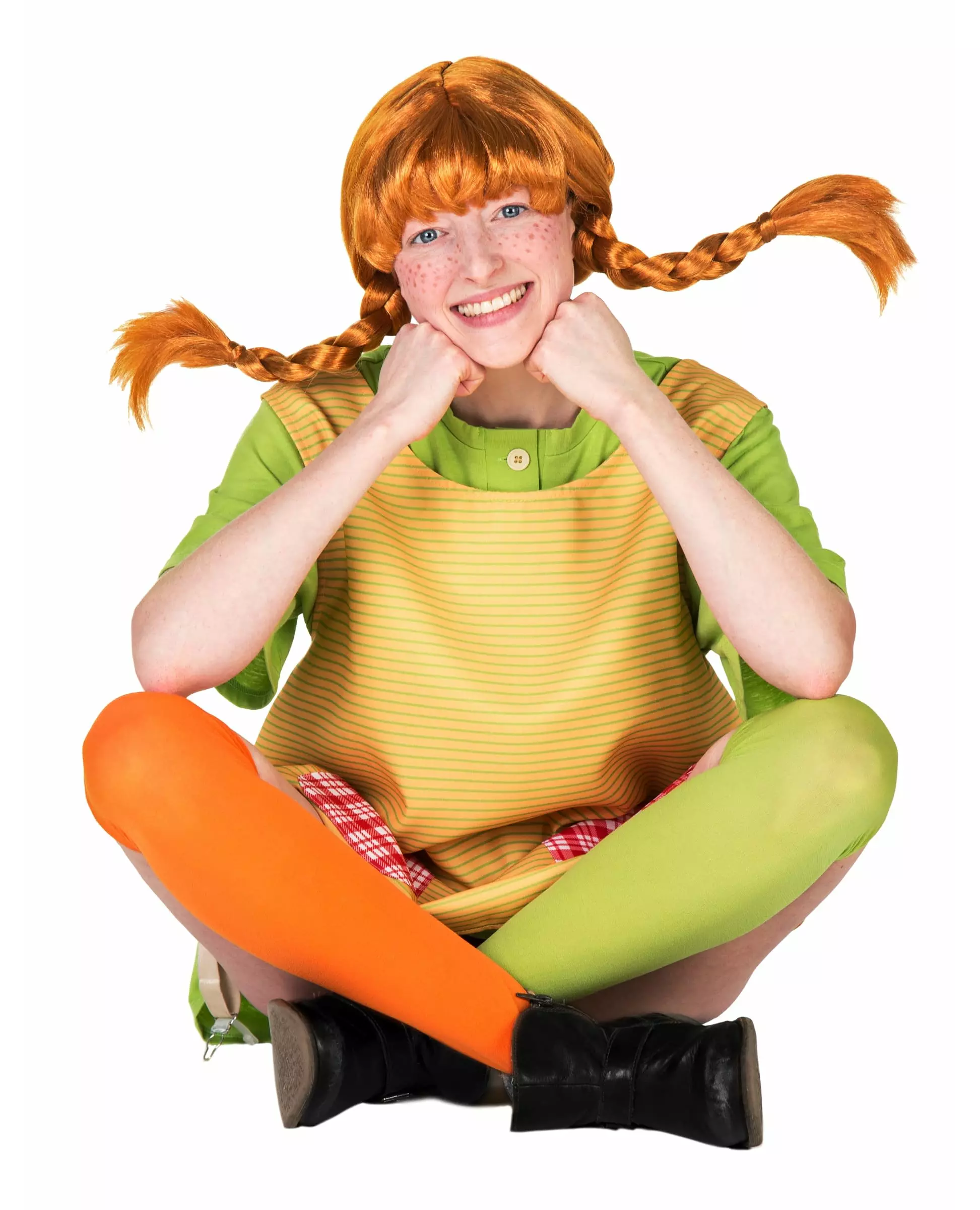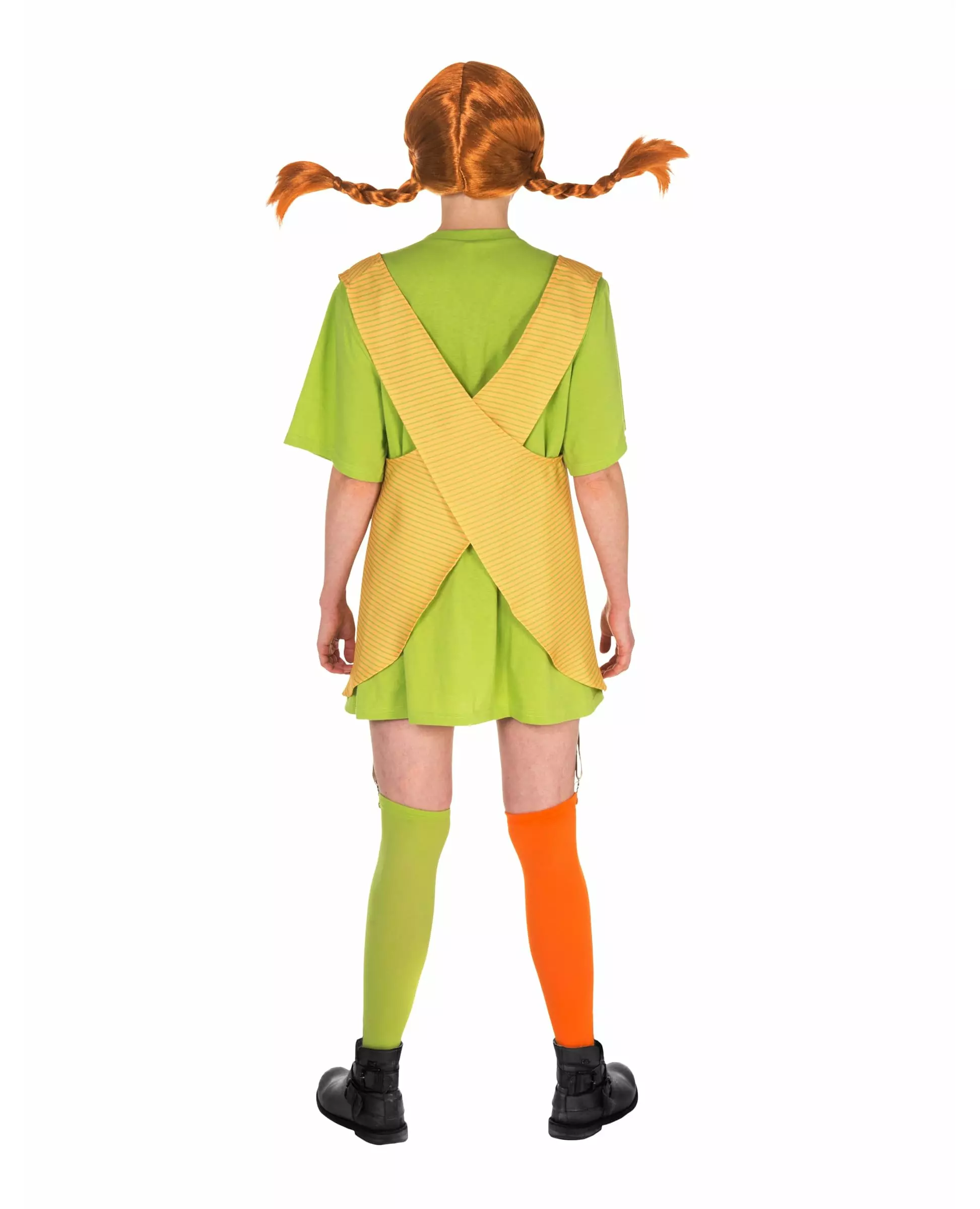 Tre inn i Pippi Langstrømpes verden! Dette Pippi Langstrømpe-kostymet for kvinner er offisielt lisensiert. Det består av en tunika, en overkjole og et par strømper. Tunikaen er grønn og går til låret med strømpeholdere sydd fast for å holde de oransje og grønne strømpene. To knapper er plassert foran. Overkjolen er gul- og grønnstripete med to rød-hvite rutete lommer. Tre inn i Pippi Langstrømpes verden og bli med på et eventyr til karnevalet! Inkludert tilbehør: -overkjole -strømper -tunika med strømpeholder Materiale: 100 % polyester Vedlikehold: Håndvask