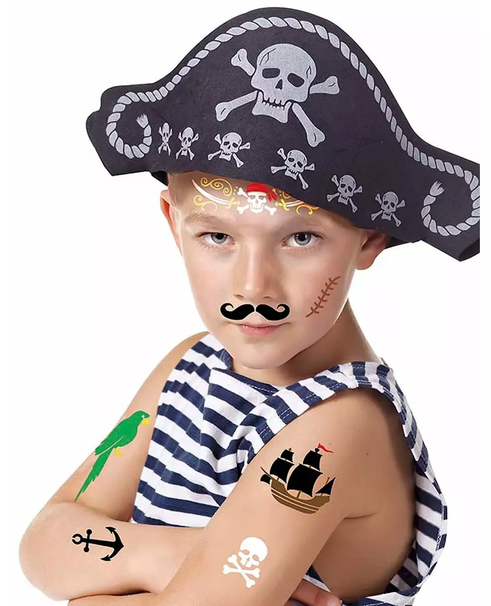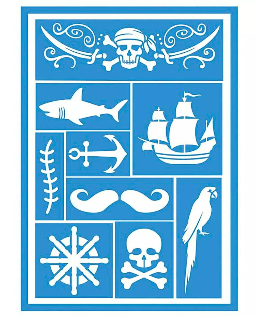 En ekte piratsminke til karnevalet! Denne sminkesjablongen har flere mønstre som minner om piratuniverset. På sjablongen finner du en hodeskalle, et piratskip, et anker og andre mønstre som lar deg forvandle barnet ditt til en ekte pirat. Denne sjablongen vil være perfekt for å lage piratsminke verdig de største kapteinene til karnevalet! Ingredienser: NC. Inkludert tilbehør: 1 ark med sjablonger