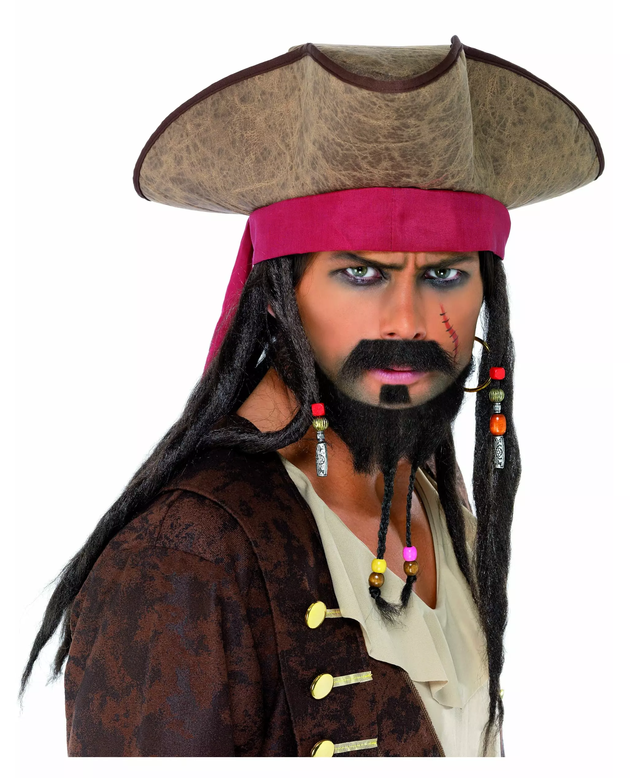 Hatt med dreadlocks! Denne piratluen for menn er laget av mykt kunstskinn. Den har en brun trikornhatt med et burgunderfarget pannebånd nederst. Svarte dreadlocks er festet på sidene for å fullføre piratutseendet ditt. Dette tilbehøret vil være perfekt for å bli en ekte pirat på en pirattemafest. Materiale: 100 % polyester 100 % polyester