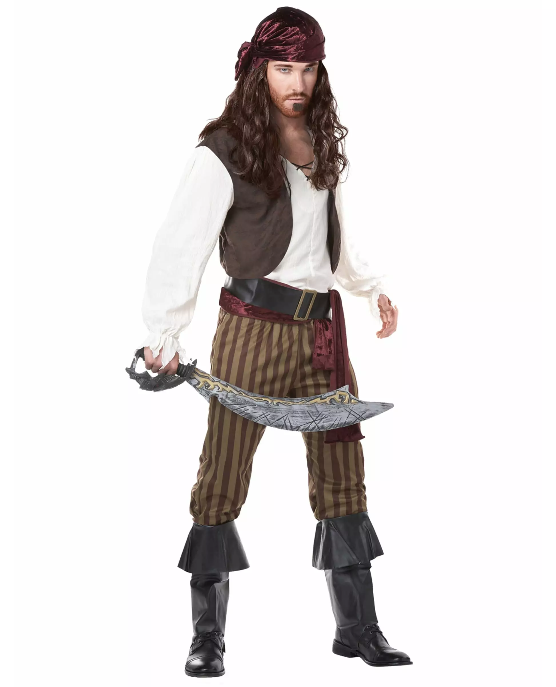 Alle om bord! Dette piratkostymet for menn består av en topp med vest, capribukser, bandana, belte og støveltrekk (sabel ikke inkludert). Den langermede toppen er ecrufarget, med en svart snor for å justere halsutringningen. En brun vest i imitert skinn er sydd på toppen. Du tar denne toppen på over hodet. Capribuksene er stripete. Midjen er elastisk for komfort. Bandanaen med fløyelseffekt er plommefarget. Den måler 98 cm lang. En stoffstripe som matcher bandanaen, som måler 19 cm høy og 200 cm lang, er inkludert. Du kan knyte den rundt livet. Det svarte beltet med skinneffekt har en metallspenne. Justerbar, den måler 8 cm høy og 128 cm lang. De to støveltrekkene med skinneffekt har en elastisk strikk som skal føres under foten. De måler ca. 30 cm i høyden. Dette piratkostymet vil være perfekt for å dra til sjøs for karneval eller til en utkledningsfest. Inkludert tilbehør: Topp med vest, Beskårne bukser, Bandana, Stoffstripe, Belte, 2 støvelovertrekk, Materiale: 100 % polyester,
