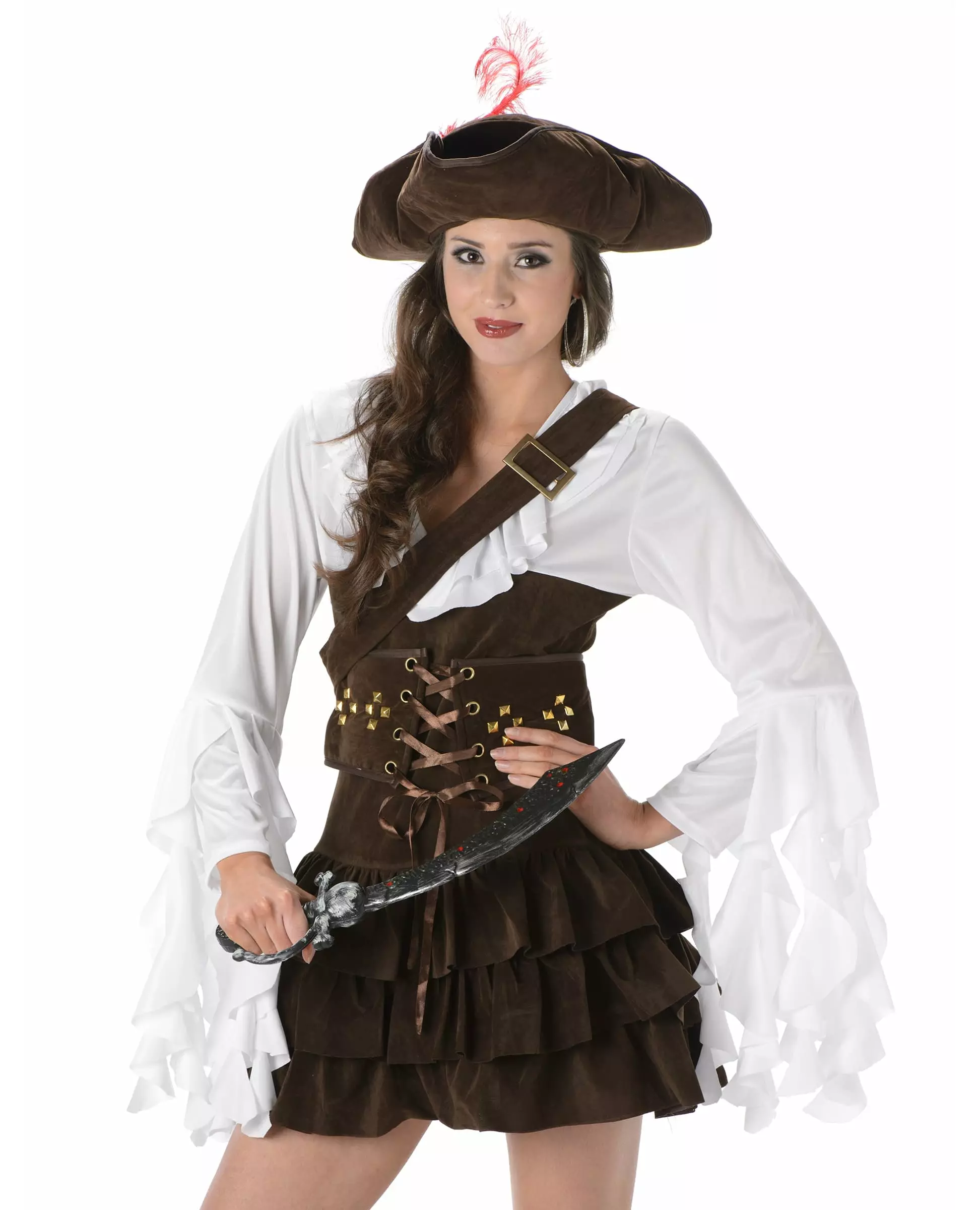 En sexy pirat! Dette kostymet for voksne består av en kjole, en hatt, et belte og et skjerf (sverd og sko ikke inkludert). Kjolen er helt brun og kort med en myk semsket følelse. Den gir en illusjon av to plagg oppå hverandre takket være den hvite skjorten som er sydd under. Sistnevnte har et samlet stoffstykke i halsen og frynser på underarmene. Skjørtets rysjer gir ekstra volum som gir antrekket en sexy effekt! Det passer perfekt til det medfølgende beltet dekorert med gullnagler som holdes i midjen med brune satengsnorer. Til slutt fullfører du antrekket med den brune hatten dekorert med den røde fjæren og skjerfet som knytes over skulderen! Sjarmér piratene på kostymefesten og dra av gårde med skatten! Inkludert tilbehør: Kjole Hatt Belte Skjerf Materiale: 100 % polyester Vedlikehold: Håndvask Målinformasjon: For en størrelse S måler kjolen omtrent 80 cm.