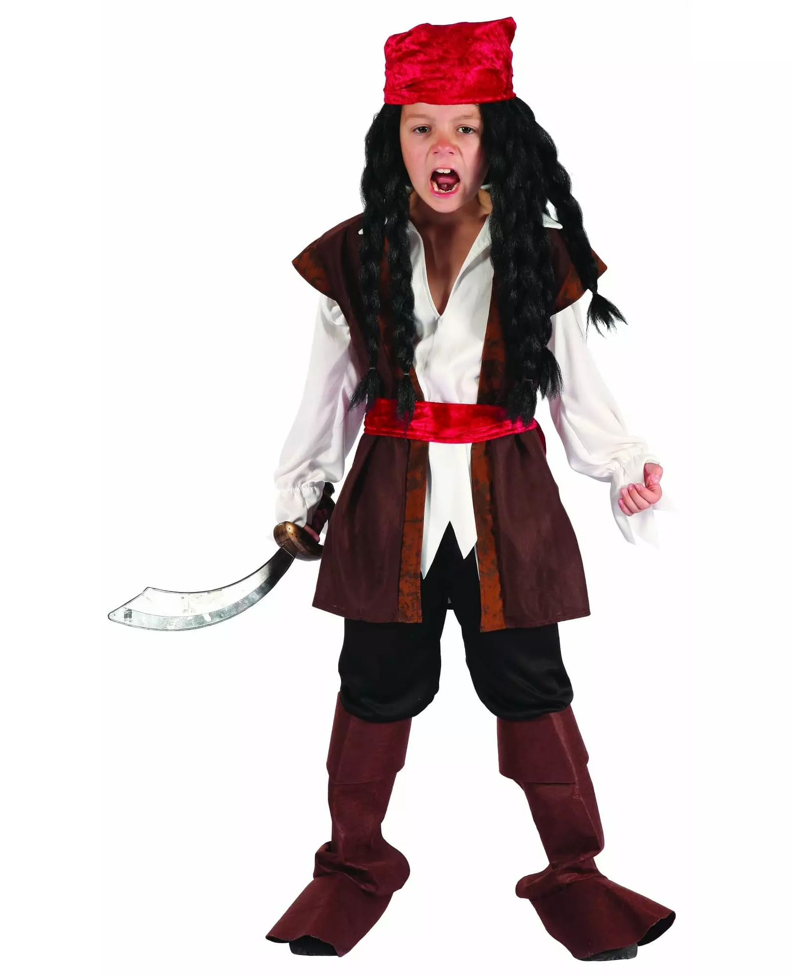 Bli tidenes største pirat! Dette piratkostymet for gutter består av en topp, bukser, et pannebånd, et par støveltrekk og et belte. (Pistol ikke inkludert) Toppen er en hvit langermet t-skjorte med en brun ermeløs vest over. Buksene er svarte. De er elastikk i midjen og anklene for bedre passform. Et lyserødt belte markerer midjen og festes med borrelås. En rød bandana fullfører antrekket. Til slutt er støveltrekkene laget av tykk brun filt og har elastikk bak. Dette komplette kostymet vil være perfekt for å forvandles til en sjørøver til en piratfest eller til karneval. Inkludert tilbehør: Topp Bukser Bandana Belte Støvler Materiale: 100 % polyester Vedlikehold: Håndvask
