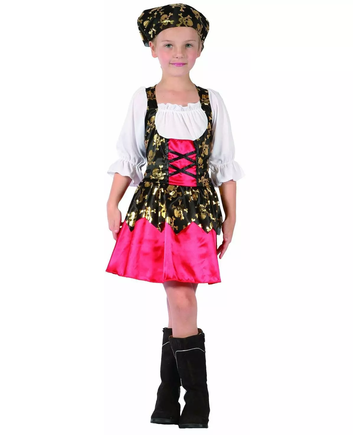 Banditt i rødt Dette piratkostymet for jenter inkluderer en kjole og et pannebånd (sko ikke inkludert). Kjolen er veldig elegant. Laget av polyester, de puffermene og halsutringningen er hvite. Underskjørtet er satengrødt, og et svart slør med gullhodeskaller dekker deler av brystet og hoftene. Svarte blonder fremhever midjen. Denne kjolen er enkel å ta på uten lukking. Kostymet er lite i størrelsen. En stor svart polyesterhatt vil dekke hodet og matcher kjolen med gullhodeskaller. Til en utkledningsfest vil datteren din være en veldig feminin sjørøver. Dette kostymet er lite i størrelsen. Inkludert tilbehør: Dresshatt Materiale: 100 % polyester Stell: Håndvask Målinformasjon: For størrelse 7/9 år: kjole 66 cm lang og 29 cm bred.