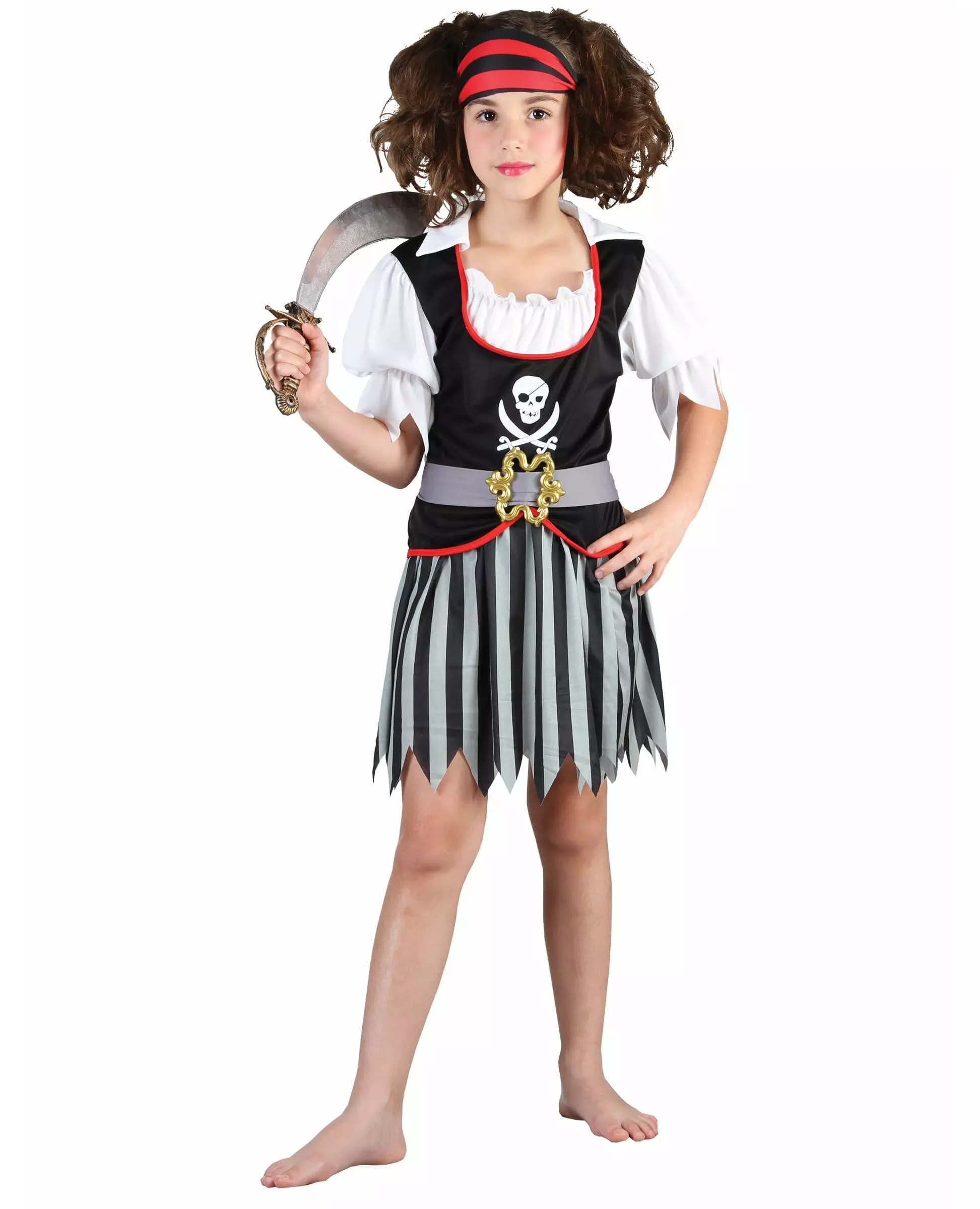 Bli en liten pirat til karnevalet. Dette piratkostymet for jenter består av en topp, et skjørt, et pannebånd og et belte (sverd ikke inkludert). Toppen er svart med en rød kant ved bysten. En hvit hodeskalle er trykt foran. Toppen er elastikk i halsen og på armene for komfort. De korte ermene er hvite, kuttet i spisser nederst. Det korte stripete skjørtet er svart og grått. Det er kuttet i spisser nederst. Det er elastikk i midjen. Beltet er grått med en gullspenne foran. Det festes enkelt med en ripe. Til slutt vil et svart og rødt pannebånd fullføre settet. Dette kostymet vil være perfekt for å legemliggjøre en ekte piratleder til karnevalet. Inkludert tilbehør: Topp Skjørt Pannebånd Belte Materiale: 100 % polyester Stell: Håndvask Målinformasjon: For størrelse 7/9 år (L), skjørt ca. 37 cm langt For størrelse 10/12 år (L), skjørt ca. 44 cm langt