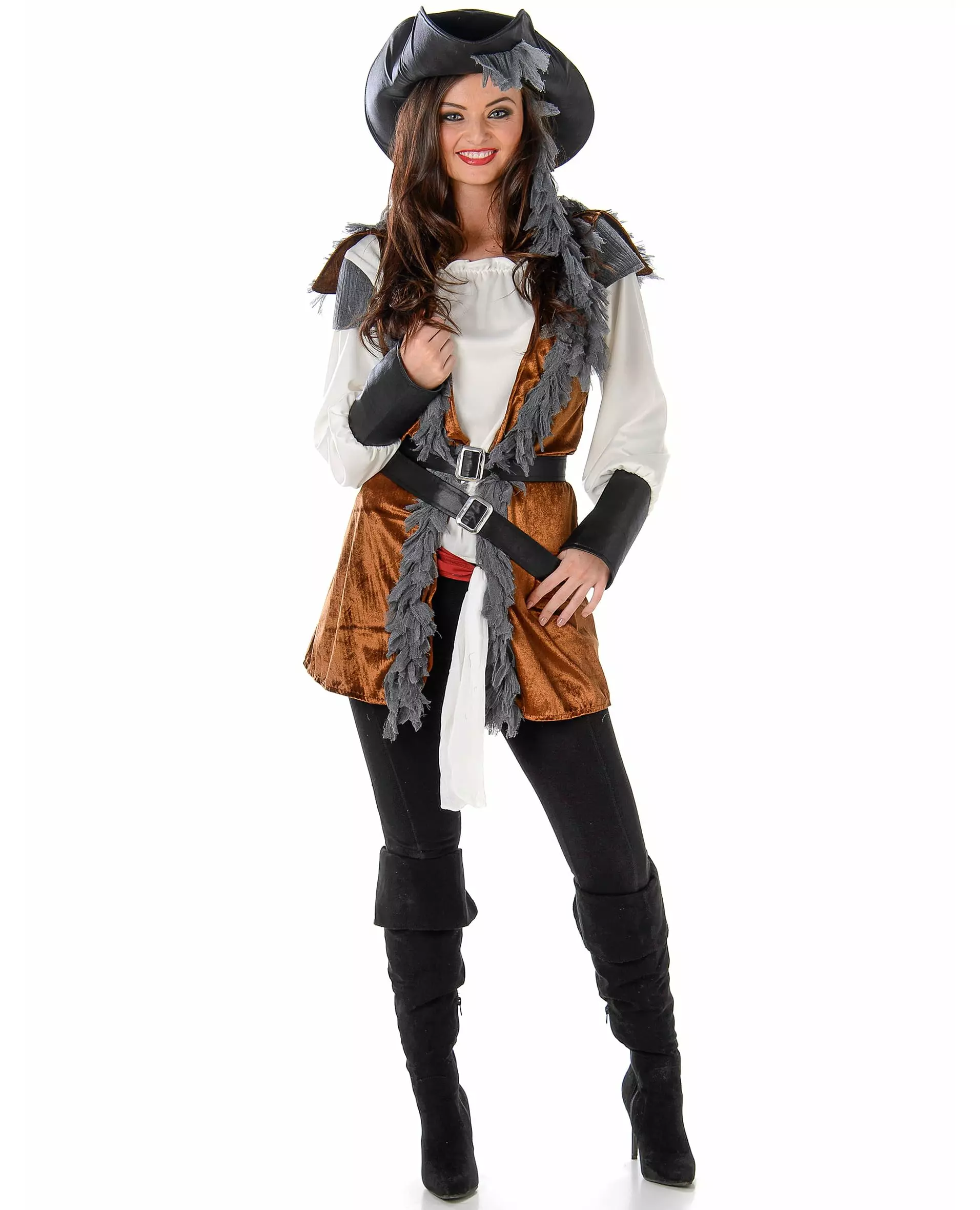 Alle om bord! Dette piratkostymet for kvinner består av en topp, en vest, to belter og to skjerf. Den hvite toppen har lange ermer. Den passer perfekt til den brune vesten. To svarte belter vil fremheve midjen din og fremheve piratutseendet ditt. Detaljen ved dette kostymet er de to grå skjerfene som gir et feminint preg til antrekket. Til slutt er en svart hatt til stede for å fullføre kostymet. Legemliggjør en praktfull pirat til ditt neste kostymefest eller til karneval. Inkludert tilbehør: Toppvest, hatt, to belter, to skjerf. Materiale: 100 % polyester. Pleie: Håndvask.