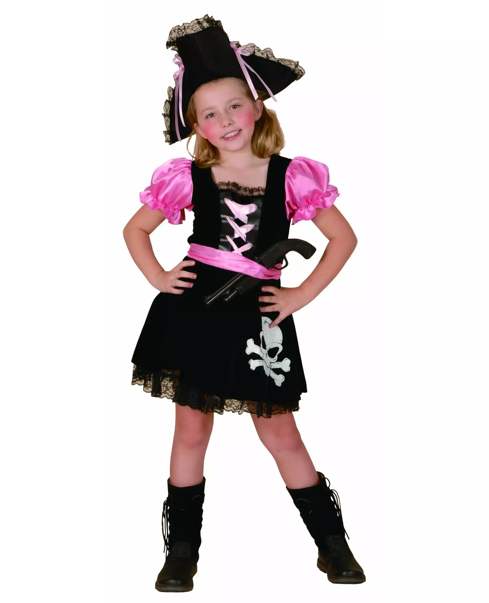 Bli den største piraten! Dette piratkostymet for jenter består av en kjole og en hatt (pistol og sko ikke inkludert). Den korte kjolen er svart, i et fløyelslignende stoff. Den har korte, puffede, satengrosa ermer. Rosa snøring er også til stede foran. En hvit hodeskalle er trykt nederst på kjolen. Et satengrosa belte er festet foran på kjolen. Nederdelen av kjolen er foret med svart blonder. Denne kjolen er elastikk bak i livet. Til slutt vil en svart trefarget hatt laget av fin filt gjøre deg til en ekte pirat. Den er dekorert med rosa sløyfer og foret med svart blonder. Dette kostymet vil være perfekt for å bli en ekte piratleder til karnevalet. Inkludert tilbehør: Dresshatt Materiale: 100 % polyester Pleie: Håndvask