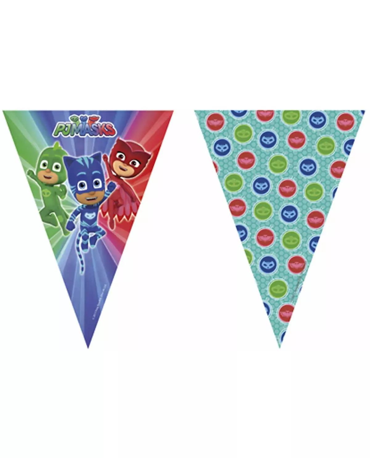 Bekjemp superskurkene! Denne plastgirlanderen er offisielt lisensiert av Pyjamasques™. Den måler omtrent 2,3 meter lang og består av 9 trekantede vimpler som er omtrent 25 cm høye. Figurene Bibou, Yoyo og Gluglu er representert på vimplene, i likhet med symbolene som representerer dem: uglen, katten og øglen. Du kan henge girlanderen din i endene. Denne girlanderen vil være perfekt for å dekorere rommet ditt til bursdagen til barnet ditt som er fan av tegneserien! Inkludert tilbehør: Girlander Materiale: Plast