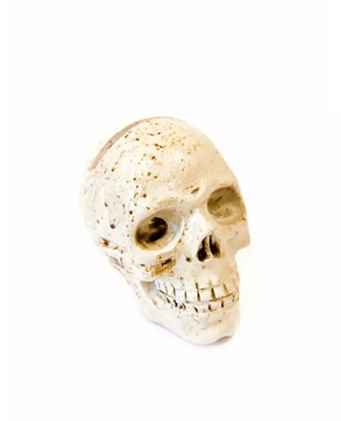 Vil gjestene dine tørre å sette seg ned? Denne harpikshodeskallen måler 4,5 x 5,5 cm. Det er et spor på toppen av hodeskallen for å plassere et stykke papp. Denne hodeskallen vil enkelt finne sin plass på bordet til et Halloween-måltid. Inkludert tilbehør: Hodeskalle Materiale: Harpiks, plast