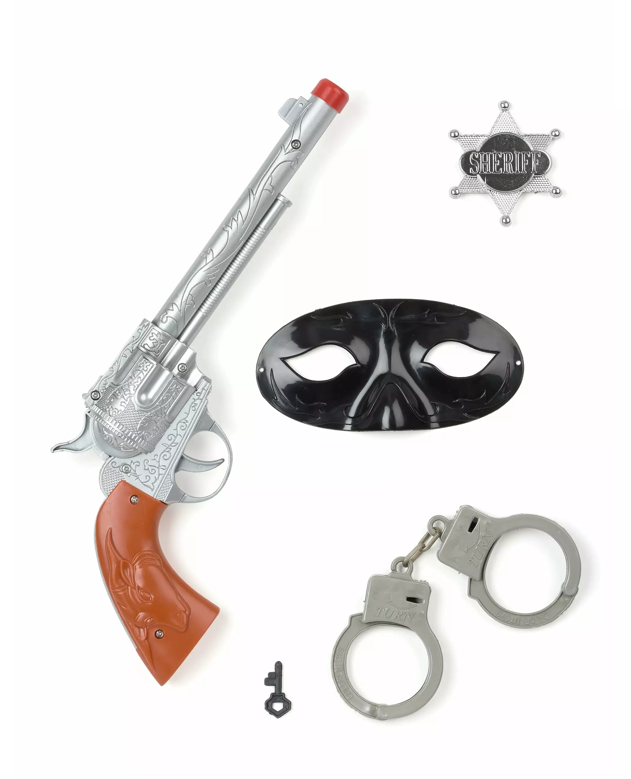 Hendene opp! Dette cowboysettet består av en pistol, en sheriffstjerne, håndjern og en maske. Pistolen måler omtrent 30 cm i lengden. Dette komplette plastsettet vil være perfekt for å forvandle deg til en ekte sheriff av Ville Vesten under kostymefester eller andre festlige begivenheter. Inkludert tilbehør: Pistolstjerne Håndjern Maske Materiale: Plast