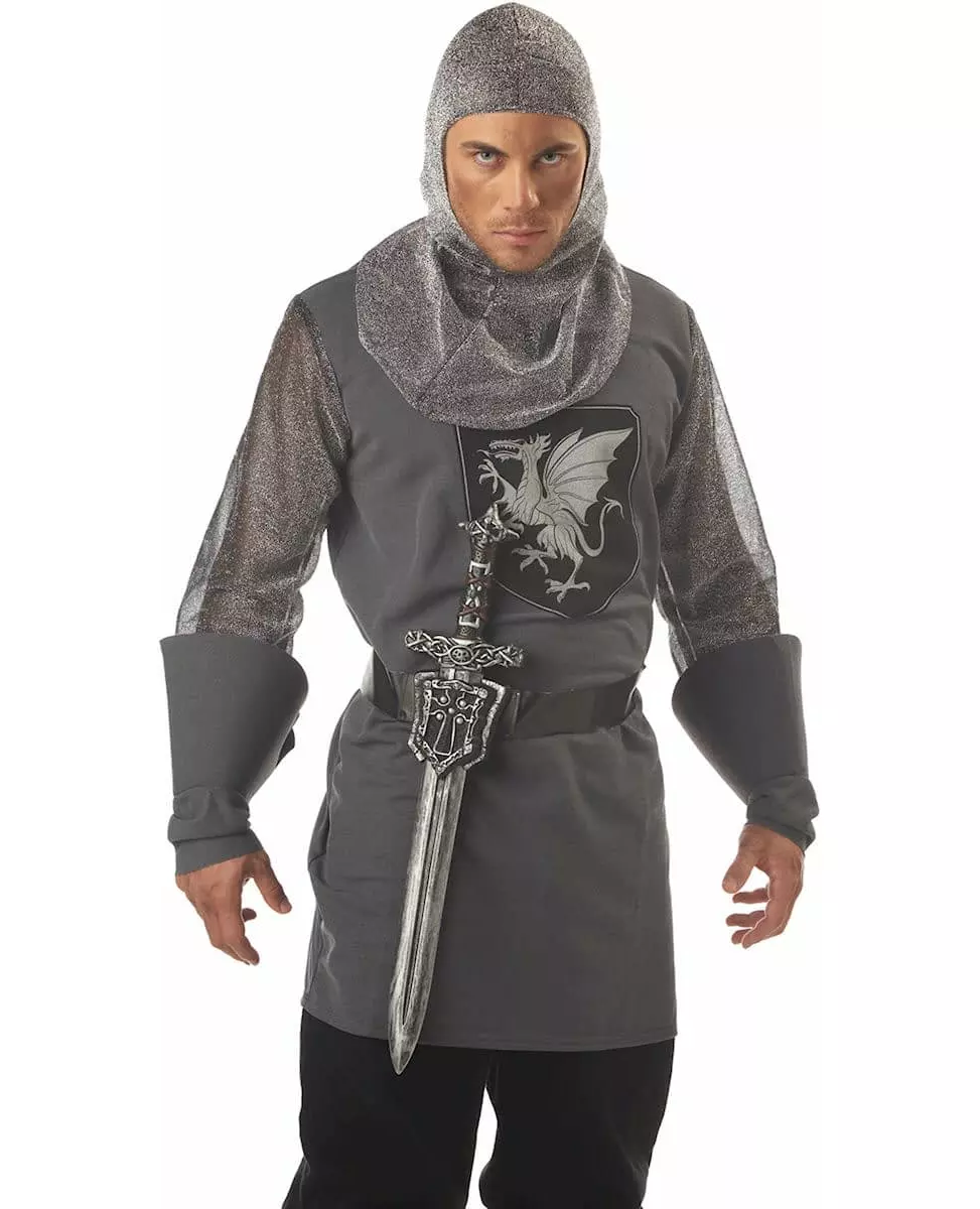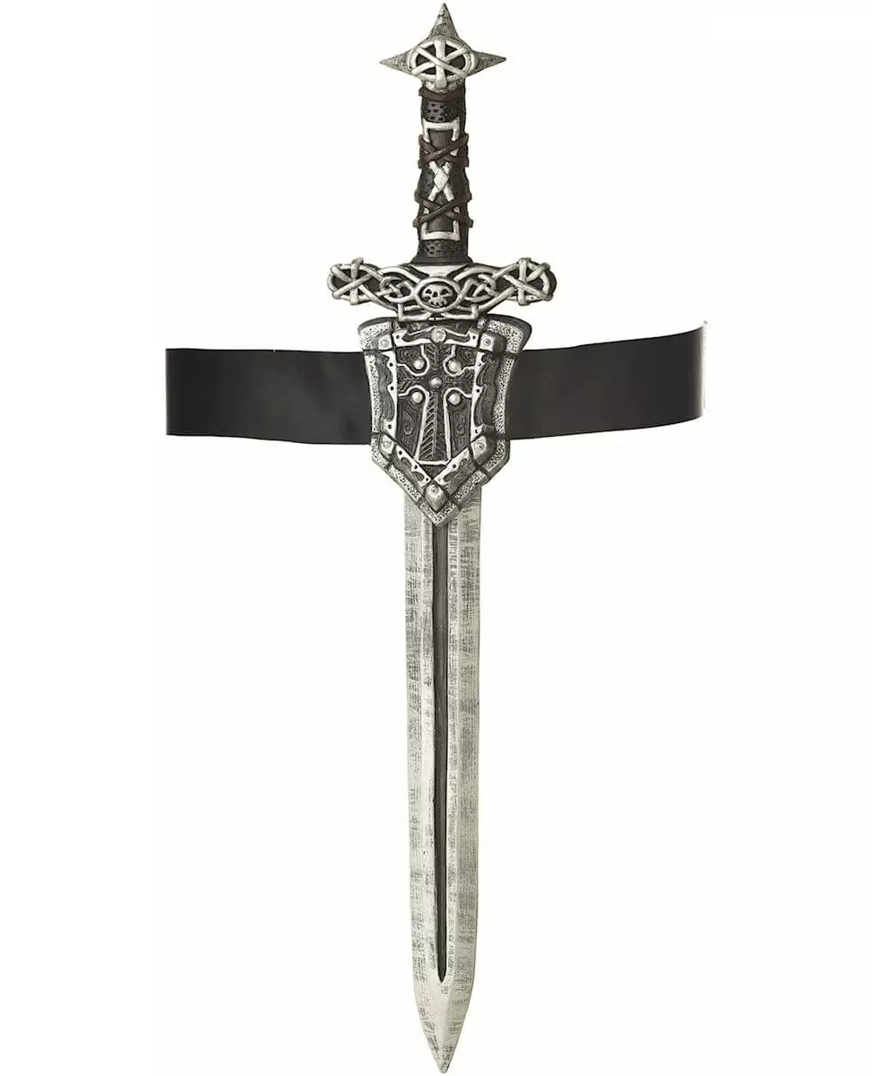 Spill som en ridder! Dette riddersettet består av et sølvfarget riddersverd i plast og et svart belte. Håndtaket ender i pigger, og midten av beskyttelsen representerer en hodeskalle. Ved bunnen av bladet er det et våpenskjold med et religiøst kors i midten. Bladet er rett med en spor i midten, sverdet måler 61 cm. For å fullføre et ridderkostyme vil dette sverdet være ideelt. Inkludert tilbehør: Sverdmateriale: Plast